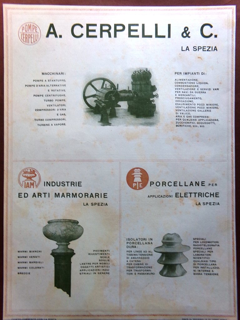 Pubblicità del 1925 Cerpelli Pompe Stantuffo Marmi Isolatori Porcellane Spezia