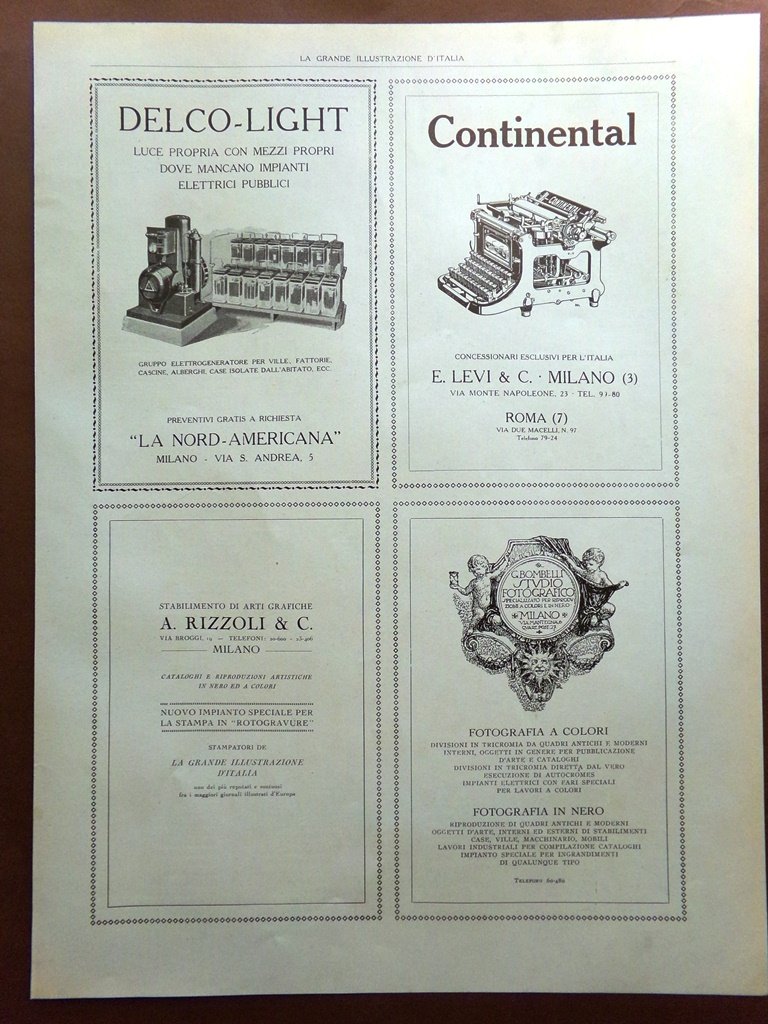 Pubblicità del 1925 Delco-Light Rizzoli Continental Bombelli Macchine Cerpelli