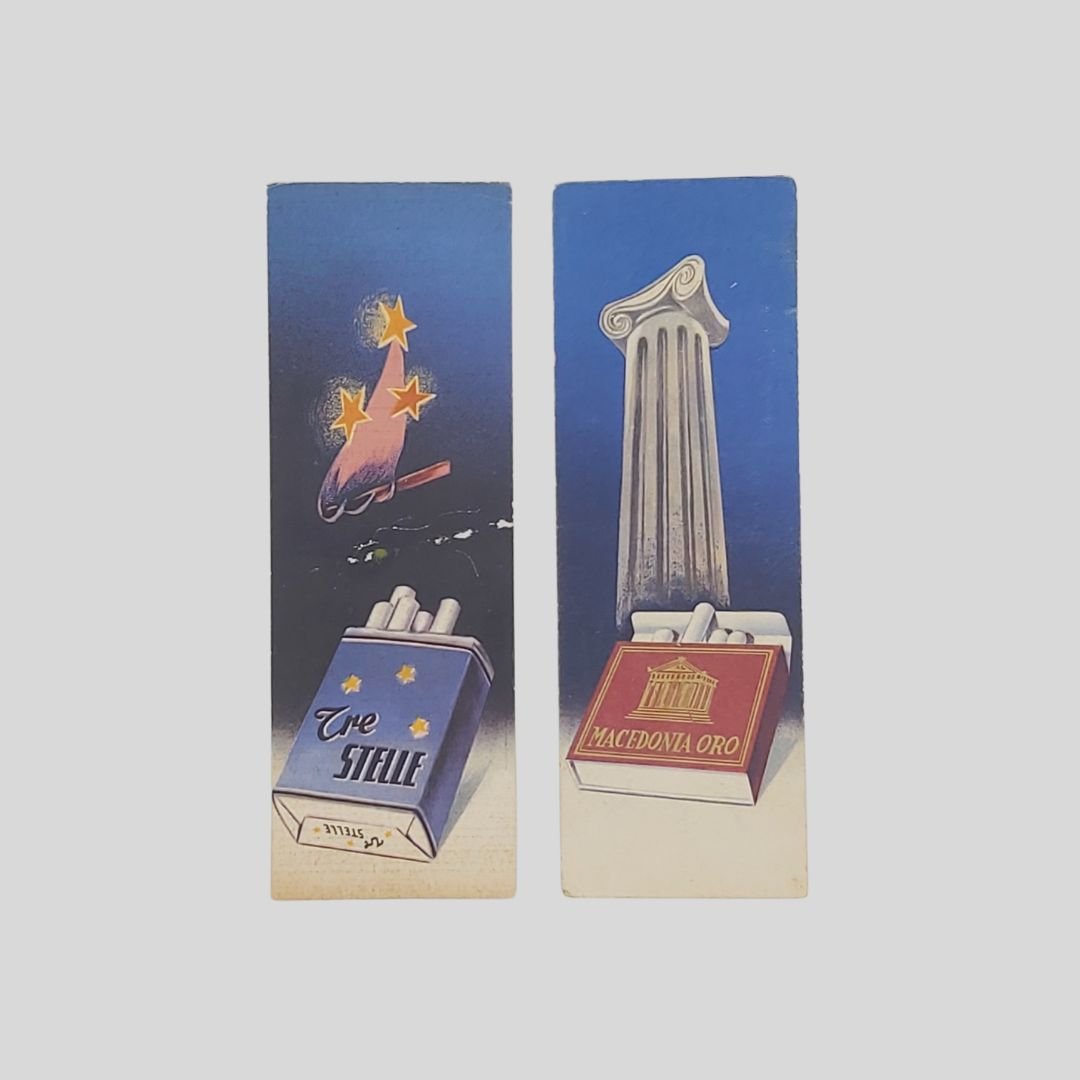 Pubblicità segnalibri sigarette. Tre Stelle, Macedonia Oro, Due Palme, Edelweiss.