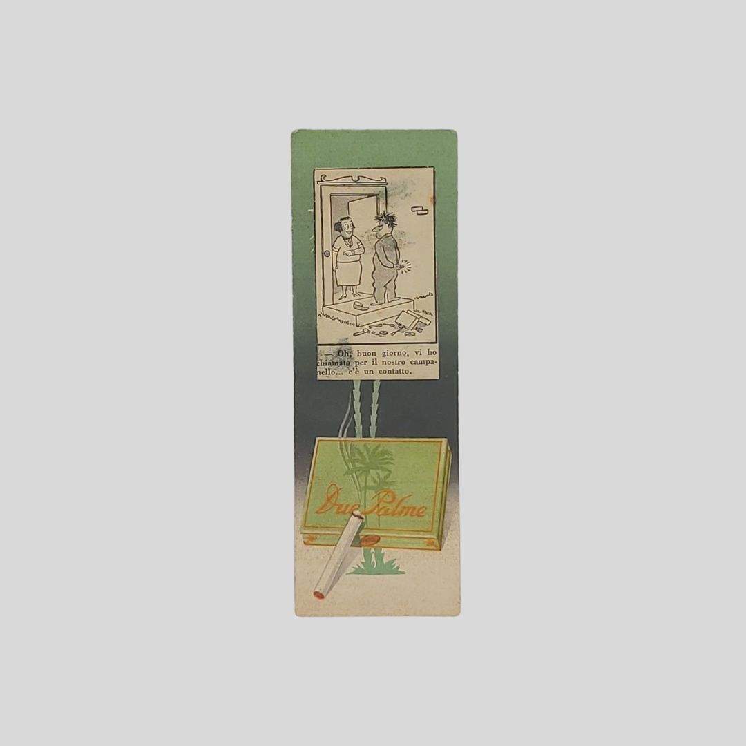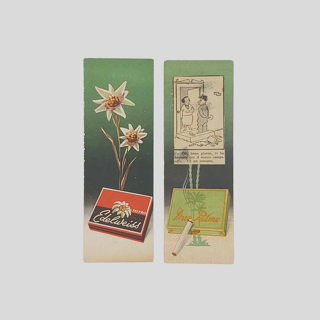 cm 5,5x16. Lotto di 2 segnalibri, stampati al recto-verso. Tracce d'uso. Al verso pubblicità sigarette Due Palme con vignetta umoristica e Edelweiss