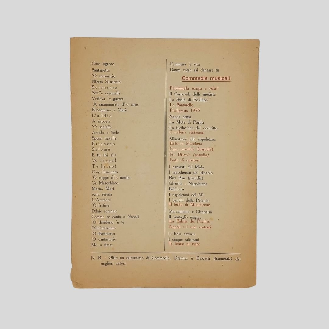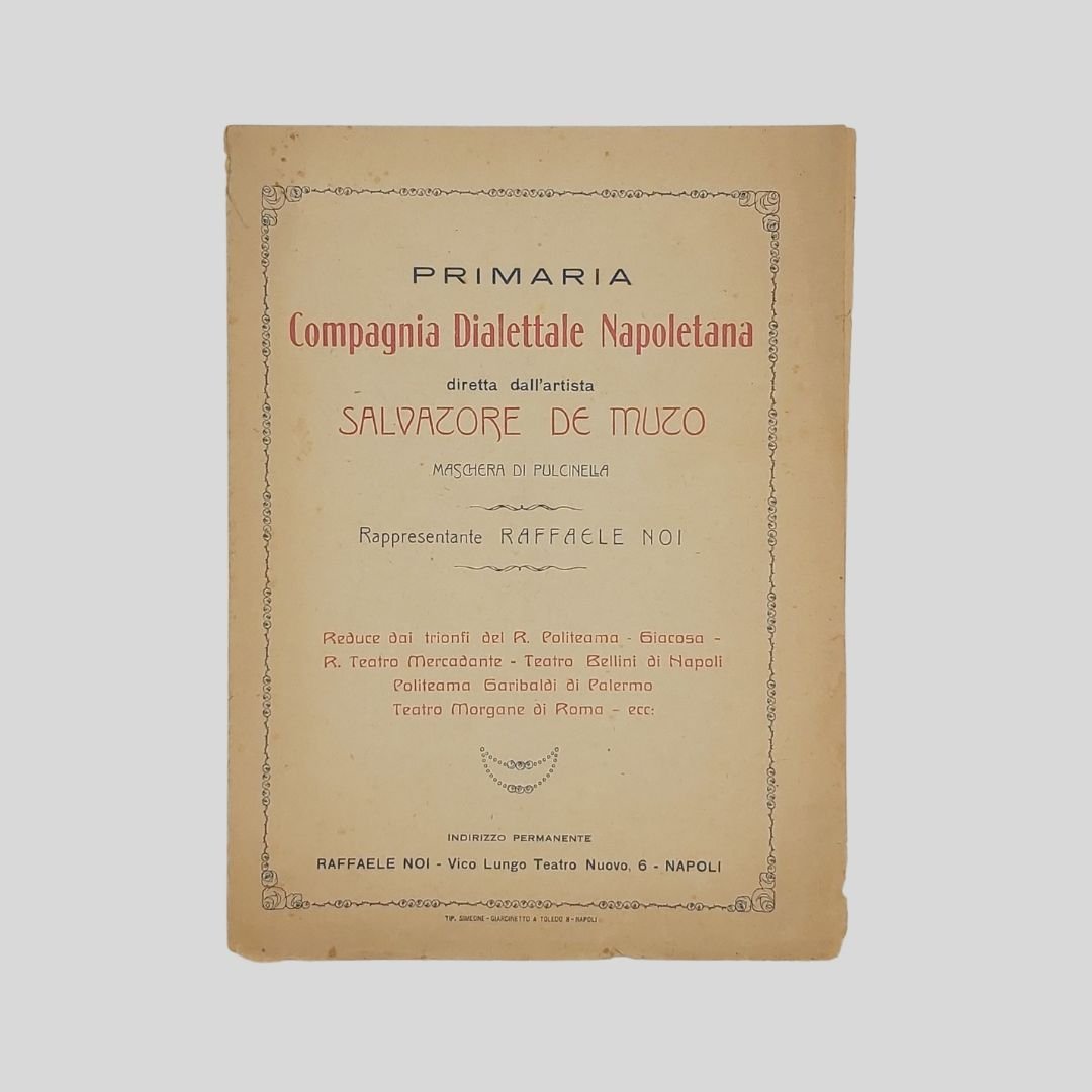 Bifolio, mm 175×235 (formato chiuso), stampato in rosso e blu, cornice floreale alla pagina del titolo. Napoli, Tip. Simeone. s.d. (1925 ca.). Contiene elenco artistico per l’inserimento del nome degli attori e delle attrici; repertorio delle «Commedie, Canzoni sceneggiate, Commedie musicali. N.B. Oltre un estesissimo di Commedie, Drammi e Bozzetti drammatici dei migliori autori». Esemplare brunito. Non comune. Il repertorio artistico della Compagnia di Salvatore De Muto, l’ultimo Pulcinella. Reduce dai trionfi del R. Politeama-Giacosa – R. Teatro Mercadante – Teatro Bellini di Napoli. Politeama Garibaldi di Palermo. Teatro Morgane di Roma – ecc.Il repertorio è ricco delle commedie di maggior successo dell’ultimo Pulcinella: ‘O sciopero d’ ‘e cuoche, ‘O munaciello dint’ ‘a casa ‘e Pulicinella, Le 100 disgrazie di Pulicinella, Pulcinella al Cinematografo, Il suicidio di Pulcinella, Prestami tua moglie, La Dama bianca…Canzoni sceneggiate: Pupatella, ‘O spusarizio, ‘O Cuppéè d’a ‘a morte, Me sì ffrate…Commedie musicali: Palummella zompa e vola! La Stella di Posillipo, La Muta di Portici, Gheisha napoletana, I napoletani del 60, Piedigrotta 1925. Salvatore De Muto [Napoli 1876 – Napoli 1970] Destinato dai familiari alla professione medica scelse caparbiamente di assecondare la sua passione per il teatro e, malgrado le difficoltà e i rifiuti iniziali, riuscì nell’intento, tanto da essere tradizionalmente considerato l’ultimo Pulcinella. A tredici anni aveva già una notevole familiarità con il suo personaggio; nel 1908 debuttò al Politeama di Napoli in sostituzione del compianto Pasquale Balzano e nel 1913 ottenne l’investitura ufficiale da parte di Giuseppe De Martino, Pulcinella senior. Lavorò in tutti i teatri italiani in stretta collaborazione con la moglie Rosa; durante il secondo conflitto mondiale fu chiamato a recitare per le truppe impegnate nelle operazioni belliche. Nel 1949 recitò per l’ultima volta al Teatro Politeama di Napoli. Nel 1954, per l’inaugurazione del teatro San Ferdinando di Napoli, Eduardo De Filippo lo volle come consulente per l’allestimento dell’opera Palummella zompa e vola. La lunga carriera non produsse effetti positivi sulla sua esistenza: ritenuto esponente di un’epoca ormai superata, non ottenne i riconoscimenti che le sue capacità artistiche avrebbero meritato. Cfr. SIUSA – Sistema Informativo Unificato per le Soprintendenze Archivistiche