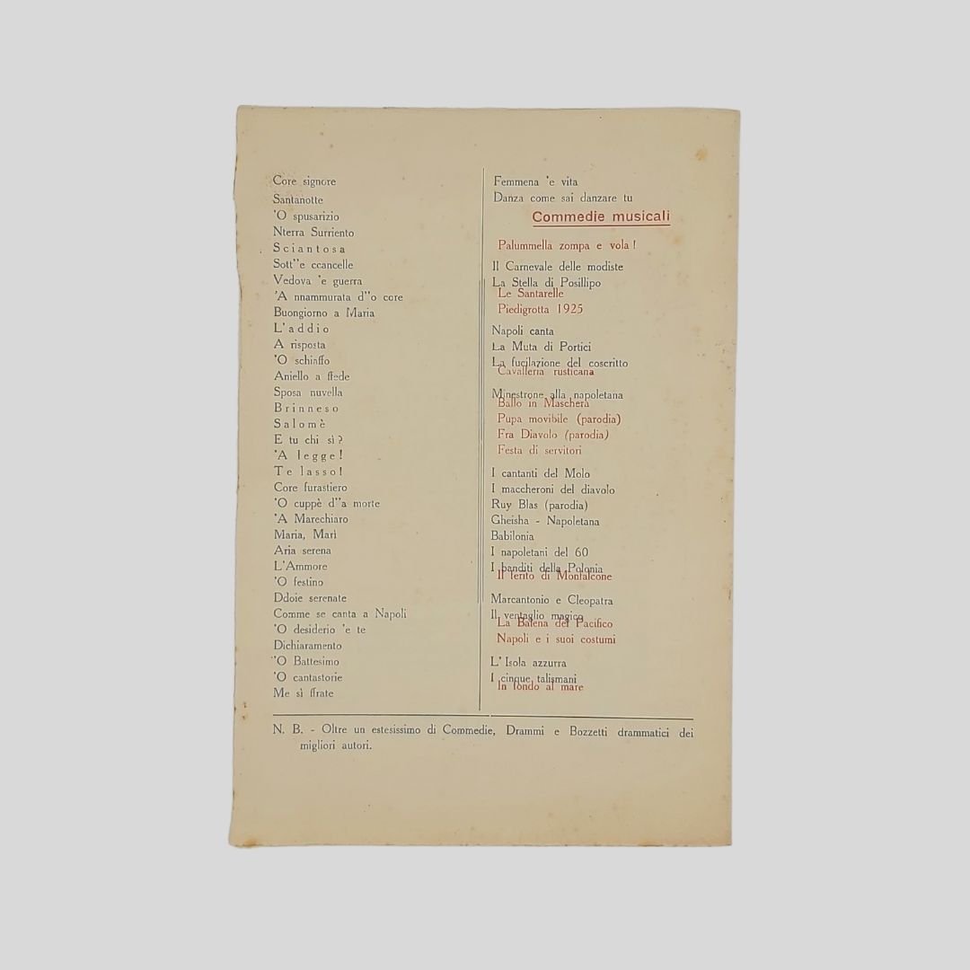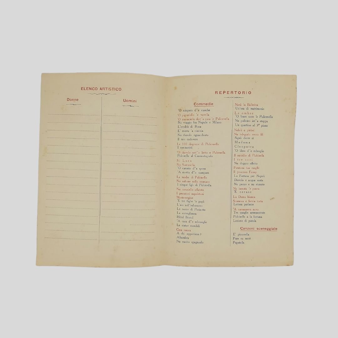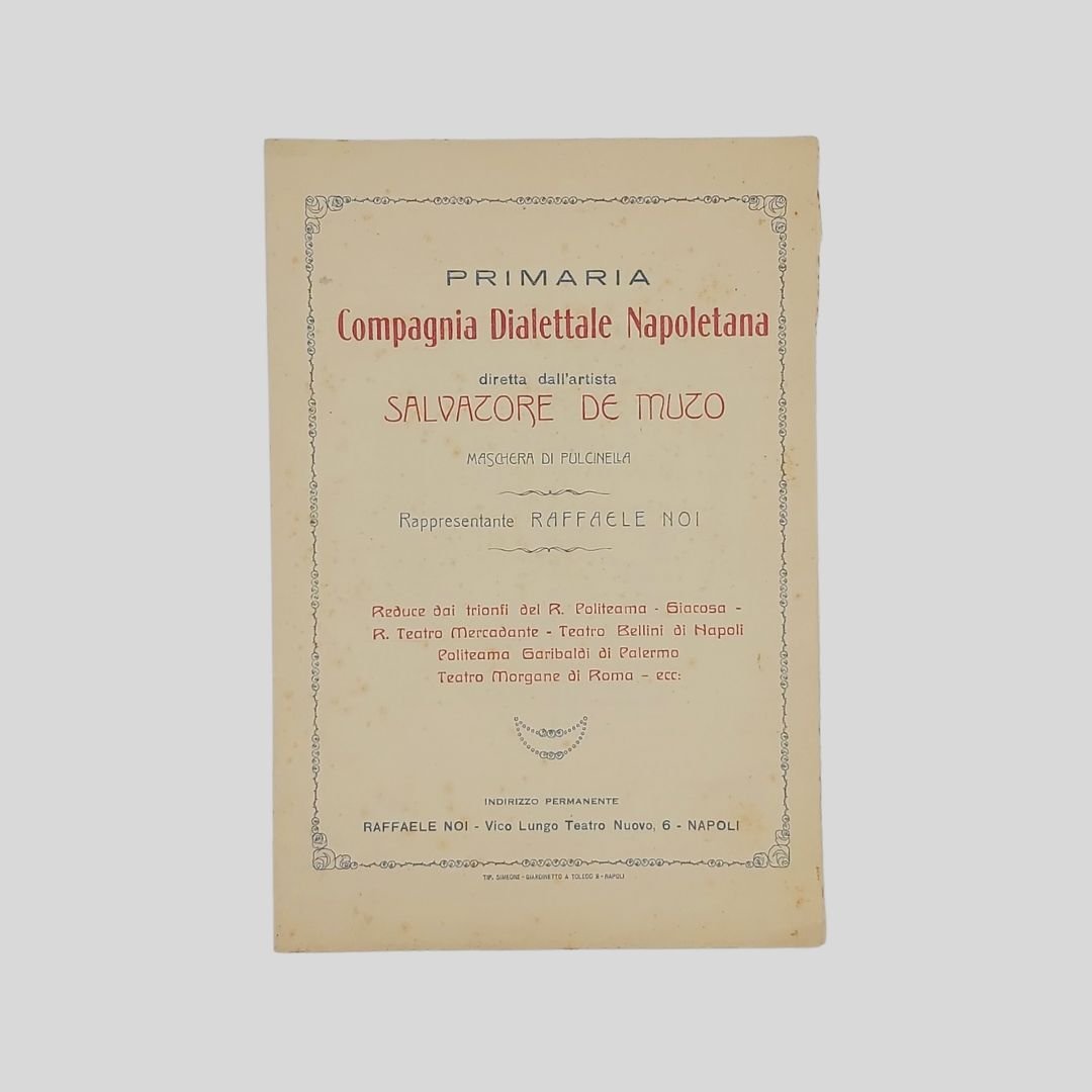 Cartoncino pieghevole a due ante, mm 175×235 (formato chiuso), stampato in rosso e blu, cornice floreale alla pagina del titolo. Napoli, Tip. Simeone. s.d. (1925 ca.). Contiene elenco artistico per l’inserimento del nome degli attori e delle attrici; repertorio delle «Commedie, Canzoni sceneggiate, Commedie musicali. N.B. Oltre un estesissimo di Commedie, Drammi e Bozzetti drammatici dei migliori autori». Insignificanti fioriture, in buone condizioni. Non comune. Il repertorio artistico della Compagnia di Salvatore De Muto, l’ultimo Pulcinella. Reduce dai trionfi del R. Politeama-Giacosa – R. Teatro Mercadante – Teatro Bellini di Napoli. Politeama Garibaldi di Palermo. Teatro Morgane di Roma – ecc. Il repertorio è ricco delle commedie di maggior successo dell’ultimo Pulcinella: ‘O sciopero d’ ‘e cuoche, ‘O munaciello dint’ ‘a casa ‘e Pulicienlla, Le 100 disgrazie di Pulicinella, Pulcinella al Cinematografo, Il suicidio di Pulcinella, Prestami tua moglie, La Dama bianca…Canzoni sceneggiate: Pupatella, ‘O spusarizio, ‘O Cuppéè d’a ‘a morte, Me sì ffrate…Commedie musicali: Palummella zompa e vola! La Stella di Posillipo, La Muta di Portici, Gheisha napoletana, I napoletani del 60, Piedigrotta 1925. Salvatore De Muto [Napoli 1876 – Napoli 1970] Destinato dai familiari alla professione medica scelse caparbiamente di assecondare la sua passione per il teatro e, malgrado le difficoltà e i rifiuti iniziali, riuscì nell’intento, tanto da essere tradizionalmente considerato l’ultimo Pulcinella. A tredici anni aveva già una notevole familiarità con il suo personaggio; nel 1908 debuttò al Politeama di Napoli in sostituzione del compianto Pasquale Balzano e nel 1913 ottenne l’investitura ufficiale da parte di Giuseppe De Martino, Pulcinella senior. Lavorò in tutti i teatri italiani in stretta collaborazione con la moglie Rosa; durante il secondo conflitto mondiale fu chiamato a recitare per le truppe impegnate nelle operazioni belliche. Nel 1949 recitò per l’ultima volta al Teatro Politeama di Napoli. Nel 1954, per l’inaugurazione del teatro San Ferdinando di Napoli, Eduardo De Filippo lo volle come consulente per l’allestimento dell’opera Palummella zompa e vola. La lunga carriera non produsse effetti positivi sulla sua esistenza: ritenuto esponente di un’epoca ormai superata, non ottenne i riconoscimenti che le sue capacità artistiche avrebbero meritato. Cfr. SIUSA – Sistema Informativo Unificato per le Soprintendenze Archivistiche