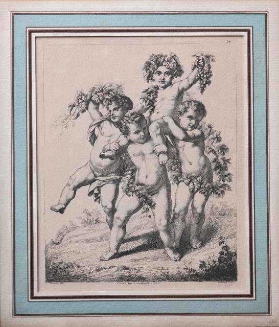 Francia, 1830 circa. Incisione in rame all'acquaforte, b/n, cm 26 x 31,5 (il foglio). Da un disegno di Rubens e con l'inciisone del Delaunay, piacevole scena con quattro puttini adorni di uva e di pampini. Vecchio passapartout con molteplice filettuatura in nero, oro e azzurro. Buona conservazione.