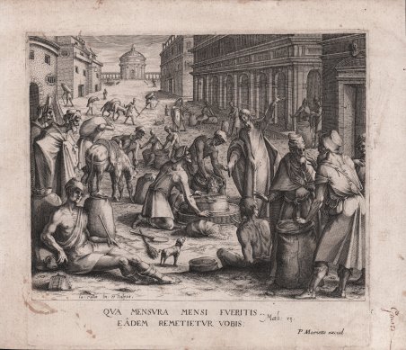 Strada di ambientazione classica, con Cristo in piedi accanto ai pesatori di grano, con il braccio alzato; in primo piano, a destra, due uomini in piedi accanto a un sacco; a sinistra un uomo seduto appoggiato a dei sacchi. Bulino, 1609/11 circa, firmato in basso 'Ia: Callot In. et Sculpsit". Sotto, citazione in latino dalla Bibbia (Matt. 7): Qua Mensura Mensi Fueritis Eadem Remetietur Vobis [Lo stesso ti sarà restituito secondo la misura del mese che hai preso]. Esemplare di secondo stato, con imprint di Mariette in basso a destra. Ottima impressione su carta vergata coeva, con margini, piccole macchie in basso a sinistra, altrimenti buono stato di conservazione. Rara. Bibliografia Meaume 1860, Recherches sur la vie et les ouvrages de Jacques Callot (52); Lieure 1927, Jacques Callot (50); 'Jacques Callot' (Nancy 1992) No.19. ' Street in a classical setting, with Christ standing next to the grain weighters, his arm raised; in the foreground, on the right, two men standing next to a bag; on the left a seated man leaning on bags; in the distance, at the end of the street, a rotunda. Engraving, circa 1609/11, lettered with production detail: 'Ia: Callot In. et Sculpsit', and quotation in Latin from the Bible (Matt. 7): Qua Mensura Mensi Fueritis Eadem Remetietur Vobis [The same will be returned to you according to the measure of the month you have taken]. Example of the second state with Mariette imprint at lower right. A fine impression on contemporary laid paper, with margins, small spots at the bottom left, otherwise good condition. Rare. Bibliografia Meaume 1860, Recherches sur la vie et les ouvrages de Jacques Callot (52); Lieure 1927, Jacques Callot (50); 'Jacques Callot' (Nancy 1992) No.19. Cfr.