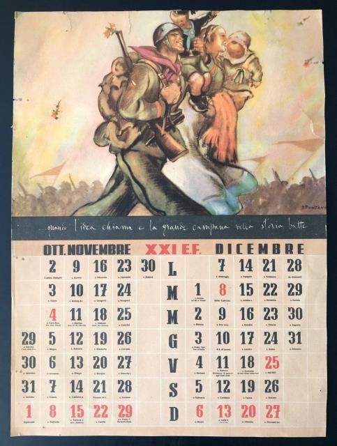 Pagina di calendario relativa ai mesi di novembre e dicembre del 1943 - XXI E. F. L'illustrazione è su disegno di D. Fontana e la pagina misura cm 33 x 45. Alcuni strappetti marginali ma buono stato.