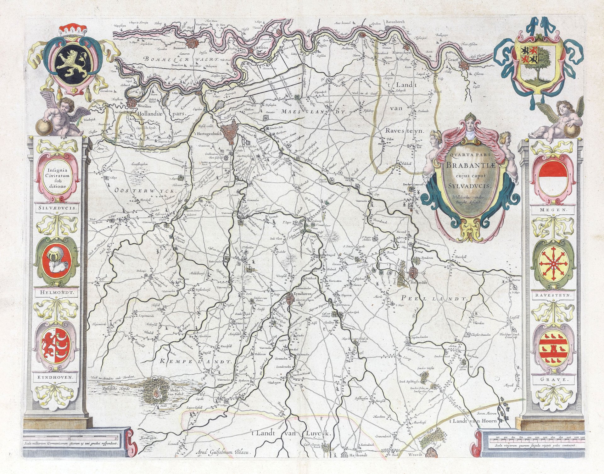 Incisione in rame, mm 420x525, testo latino al verso. Elegante e piacevole carta, tratta da Atlas Novus, arricchita da un bei cartigli con stemmi. Terzo stato. La mappa fu preparata da Willibrordus van der Burgt.<BR>Ottimo esemplare perfettamente conservato, lievemente ingiallito. W. Blaeu, astronomo allievo di Tycho Brahe, fondò un'officina per la costruzione di globi nel 1599; quasi immediatamente iniziò a pubblicare anche carte geografiche, giungendo nel 1630 alla creazione del primo atlante "Atlantis Appendix" e cinque anni dopo, della prima edizione in due tomi del "Atlas Novus". Dopo la sua morte nel 1638, a cura del figlio Johan si giunse nel 1662 alla pubblicazione del celebre "Atlas Maior" in 11 volumi. Nel 1672 un incendio distrusse l'officina e segnò la fine dell'attività. <BR>Copper engraving, mm 420x525, latin text on verso. <BR>The third state. The coat of arms of Brabant and 's-Hertogenbosch appears on the map. The municipal arms in the columns on right and left-hand side have been filled in. The map was prepared by Willibrordus van der Burgt.<BR>Considered one of the most decorative maps published by the publishing house of Blaeu.<BR>Good condition, light paper discoloration. A good example of Blaeu's map of Brabant, enriched with decorative cartouches with coat of arms. <BR>W. Blaeu, born in Alkmaar in 1571, studied astronomy by Tycho Brahe and founded a business in 1599 as a globe and instrument maker. He immediately expanded the business publishing maps and in 1630 the first atlas "Atlantis appendix" and five years later the "Atlas novus". After his death in 1638, his son Joan reached publication of the major work of the family, the "Atlas maior" in 11 volumes. In 1672 a great fire destroyed the Blaeu's printing house. <BR>