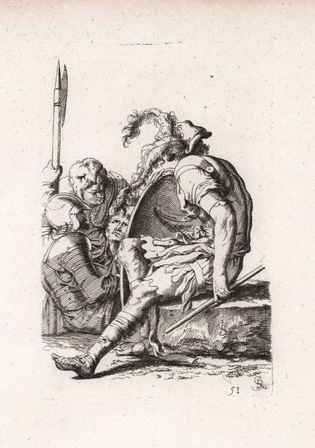 Acquaforte, circa 1675/80, priva di firma. Copia in controparte della stampa di Salvator Rosa, della serie dei capricci con soldati, detta le ' Figurine. ' La serie delle cosiddette ' Figurine ' di Salvator Rosa ebbe un grande successo, documentato dal gran numero di imitazioni che ebbe in tutta Europa. La prima edizione di questa raccolta fu realizzata dal Rosa in 62 tavole all’acquaforte incise tra il 1656 e il 1657. Almeno otto diverse copie della stessa edizione furono eseguite tra la fine del XVII e la prima metà del XVIII secolo. ' ' La serie venne inserita nella celebre ' Academia Todesca della Architectura, Scultura & Pittura: oder Teutsche Academie der Edlen Bau, Bild-und Mahlerey-Künste, raccolta monumentale, riccamente illustrata da centinaia di incisioni raffiguranti antichità, architettura e mitologia classica, edita a Norimberga e Francoforte tra il 1675 ed il 1680. ' Per le incisioni, il Sandrart si avvalse dei suoi collaboratori Karl Gustav von Amling (1650-1703); Philip Kilian (1628-1693); Richard Collin (1627-97); Georg Andreas Wolfgang (1631-1716); Johann Georg Waldreich (d.1680); Melchior Küsel (1626-1683); Franck, Johann (fl.1659-1690); George Christoph Eimmart (1638-1705); Susanna Maria von Sandrart (1658-1716); Bartholomäus Kilian (1630-1696). Bellissima prova, impressa su carta vergata coeva, con margini, in perfetto stato di conservazione. ' Bibliografia Cfr. Bartsch, Le ' Peintre graveur ' (XX.283.51); Wallace p. 330, 133; National Gallery (Washington), ' Mark J. Millard, III (1998), no. 111; F.W. H. Hollstein, ' German engravings . ca. 1400-1700 ' (1954-), 38-41; Anna Schreurs, ' Unter Minerva schutz: bildung durch kunst in Joachim von Sandrarts 'Teutscher Academie' ' (2012). Etching, ca. 1675/80, unsigned. Copy of Salvator Rosa's print from the Capricci with soldiers series, called the ' Figurine. The series of the so-called ' Figurine ' of Salvator Rosa had a great success, documented by the large number of imitations that had throughout Europe. The first edition of this collection was made by Rosa in 62 etching plates engraved between 1656 and 1657. At least eight different copies of the same edition were made between the end of the 17th and the first half of the 18th century. This set is part of the monumental ' Academia Todesca della Architectura, Scultura & Pittura: oder Teutsche Academie der Edlen Bau, Bild-und Mahlerey-Künste ' (Deutsche Academy of Architecture - Sculpture – Painting). ' The first edition, in German, was published by Joachim von Sandrart in Nuremberg, in three volumes respectively in 1675, 1679 and 1680. For the plates Sandrart used his students as and many others artist as ' Karl Gustav von Amling (1650-1703); Philip Kilian (1628-1693); Richard Collin (1627-97); Georg Andreas Wolfgang (1631-1716); Johann Georg Waldreich (d.1680); Melchior Küsel (1626-1683); Franck, Johann (fl.1659-1690); George Christoph Eimmart (1638-1705); Susanna Maria von Sandrart (1658-1716); Bartholomäus Kilian (1630-1696). The work is full of illustrations of ancient and modern Roman buildings, sculpture, the theory of painting, biographies of artists, including German and contemporary (ie seventeenth-century) artists, and antiquities. Joachim von Sandrart was a painter of some note but it is for his ' Teutsche Academie ' that he is chiefly remembered. His compendious treatise includes sections on ancient sculpture and architecture, perspective, the theory of painting, artists’ biographies, a translation of Ovid’s Metamorphoses and so on. The second part of Book I purports to give a history of art from its earliest origins, and opens with an engraving of two scenes of legendary accounts of the discovery of drawing. ' The work is dedicated to the world-renowned German nation and to champions and lovers of art ('Der Welt-berühmten Teutschen Nation . Kunst-Helden und Kunstliebenden'). Beautiful proof, printed on contemporary laid paper, with margins, in perfect condition. Bibliografia Cfr. Bartsch, Le ' Peintre graveur ' (XX.283.51); Wallace p. 330, 133; National Gallery (Washington), ' Mark J. Millard, III (1998), no. 111; F.W. H. Hollstein, ' German engravings . ca. 1400-1700 ' (1954-), 38-41; Anna Schreurs, ' Unter Minerva schutz: bildung durch kunst in Joachim von Sandrarts 'Teutscher Academie' ' (2012). Cfr.