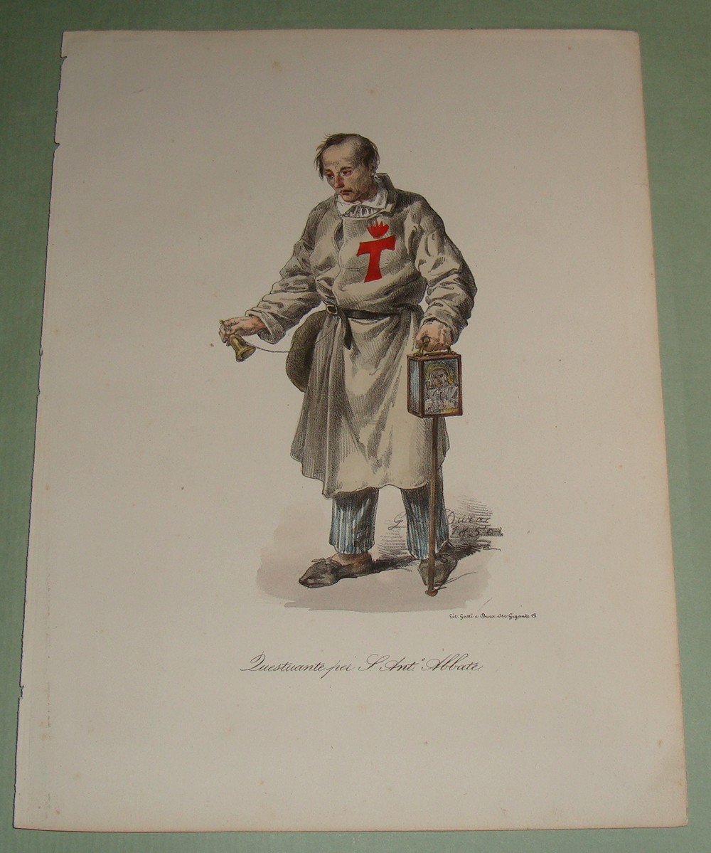 DURA G. Questuante per S.Antonio Abate. 1850. Cm.20x15. Litografia originale acquarellata. Coloritura coeva.