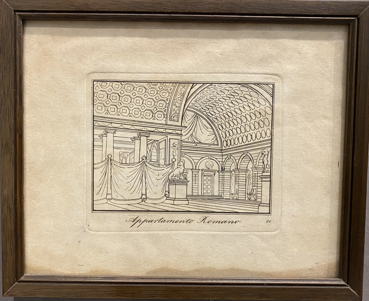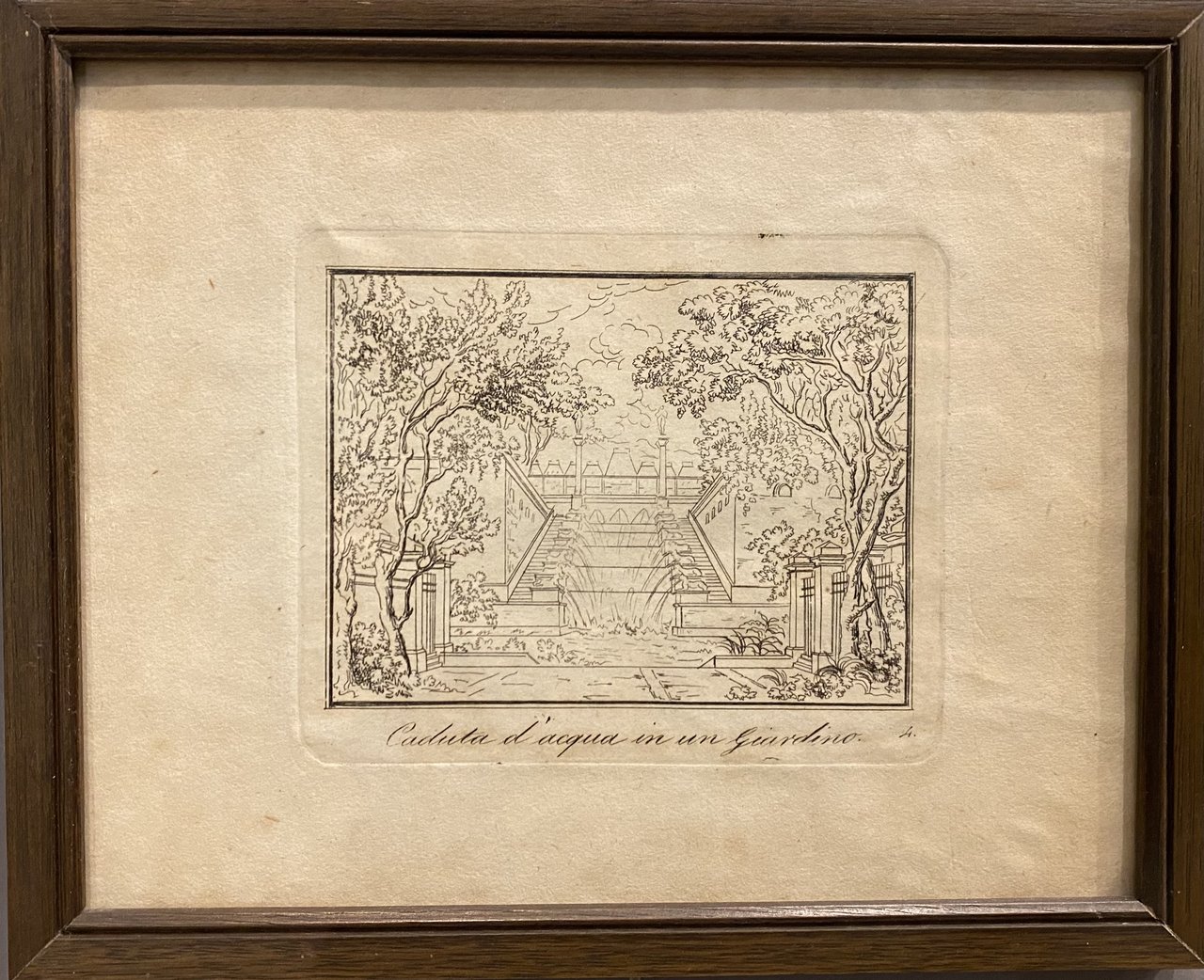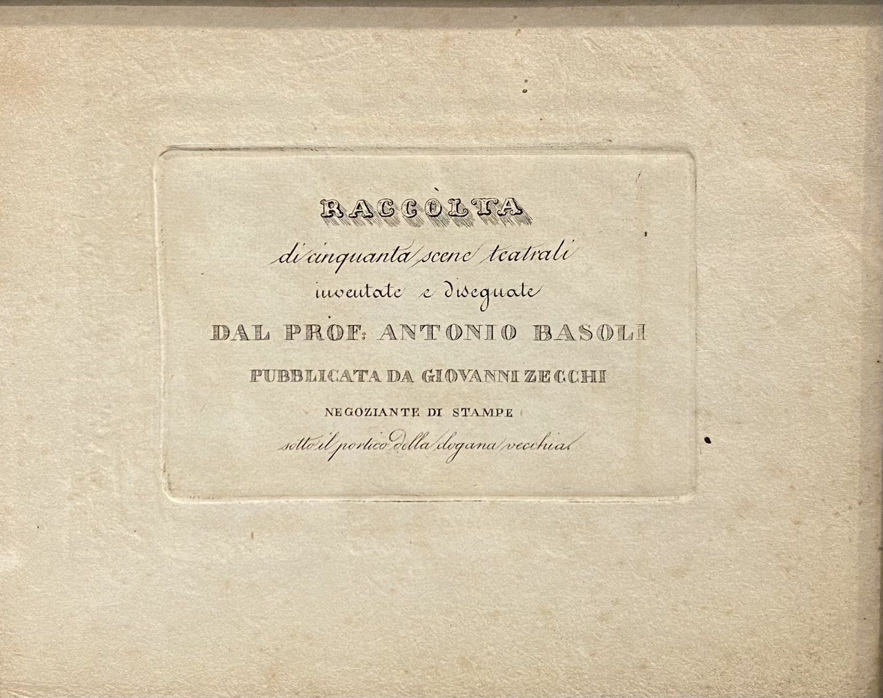 Questa serie, senza data ma concordemente da collocare al 1810, rientra in quell'ampia produzione di raccolte che l'artista realizza per diffondere la propria fama e i propri pensieri, educare allievi e amatori d'arte. La serie completa è composta dal frontespizio e da 50 scenografie di piccolo formato incise al tratto. Numerate in basso a destra presentano il titolo inciso in basso al centro oltre la cornice di inquadramento. Paesaggi, case, architetture, giardini sono descritti con un tratto netto e deciso, un ampio ventaglio di idee portatile. Ottime impressioni su carta avorio, ampi margini editoriali. Leggero ingiallimento omogeneo. I fogli si presentano montati in piccole cornici moderne color noce.