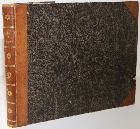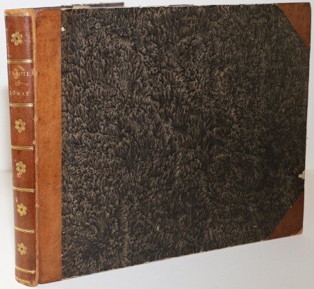 Raccolta di num. 320 Vedute sì antiche, che moderne della città di Roma. ' …Incise a bulino in N. 80 rami // In Roma / Nella Calcografia di Agapito Franzetti a Torsanguigna/ Col Permesso. L’opera si compone di un frontespizio calcografico e di 80 tavole numerate, ognuna composta da quattro vedute. Viene stampata senza data; molti repertori la datano intorno al 1790 circa, forse perché stampata su carta vergata. Una datazione intorno al 1800 ci sembra tuttavia più plausibile. ' Agapito Franzetti, calcografo attivo a Roma con bottega tra via del Corso e Torsanguigna, è noto per le sue piccole incisioni di veduta che servivano spesso come biglietti da visita. Tutte contengono, infatti, una linea in basso, dove si poteva apporre il proprio nome ad inchiostro. ' Come indicato nel titolo, le vedute raffigurano sia monumenti e antiche rovine che vedute “moderne”, con piazze, chiese e ville. Ciascuna tavola reca, in basso al centro, il nome dell’incisore. Gli artisti coinvolti sono sei: Jean-Jerome Baugean; Antonio Giuseppe Barbazza; Giovanni Battista Cipriani; Francesco Morelli; Antonio Poretta e Domenico Pronti. ' Molte delle vedute derivano dalla celebre opera di Giuseppe Vasi, Delle magnificenze di Roma antica e moderna. Pubblicata in 10 volumi dal 1747 al 1761, l’opera presenta 238 incisioni in rame, ciascuna incisione con testo narrativo che fornisce informazioni storiche e documentarie. ' Acquaforte, in buono stato di conservazione. ' Bibliografia A. Bertarelli, H. Prior, Il biglietto da visita italiano. Cintributo alla storia del costume e dell'incisione nel secolo XVII, Bergamo 1911, p. 162 Raccolta di num. 320 Vedute sì antiche, che moderne della città di Roma.Incise a bulino in N. 80 rami // In Roma / Nella Calcografia di Agapito Franzetti a Torsanguigna/ Col Permesso. Bound in half-leather, with gold tooled ornament and lettering at the spine, marbled edges. The work consists of an intaglio frontispiece and 80 numbered plates, each consisting of four views. It is printed without date; many repertories date it around 1790, perhaps because it was printed on laid paper. A date around 1800 seems more plausible. Franzetti, a chalcographer working in Rome with a workshop between Via del Corso and Torsanguigna, is known for his small engravings of views that were often used as business cards. They all contain a line at the bottom where one's name could be written in ink. The small views were often printed four to a sheet. ' As indicated in the title, the views depict both monuments and ancient ruins and "modern" views, with squares, churches and villas. Each table bears, at the bottom center, the name of the engraver. There are six artists involved: Jean-Jerome Baugean; Antonio Giuseppe Barbazza; Giovanni Battista Cipriani; Francesco Morelli; Antonio Poretta and Domenico Pronti. ' The views are made after Giuseppe Vasi’s monumental work ' Delle magnificenze di Roma antica e moderna. Published in 10 volumes from 1747 to 1761, the work features 238 copper engravings, each engraving with a narrative text that provides historical and documentary information. ' Bibliografia A. Bertarelli, H. Prior, Il biglietto da visita italiano. Cintributo alla storia del costume e dell'incisione nel secolo XVII, Bergamo 1911, p. 162 Cfr.