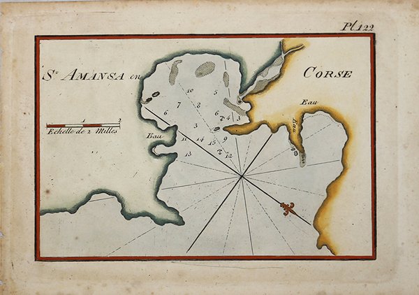 Piano nautico tratto dal " Recueil des principaux plans des ports & rades de la Méditerranée" di Josepgh Roux, pubblicato per la prima volta a Marsiglia nel 1764 e successivamente ristampato - ampliato - a Genova da Yves Gravier con il titolo "Recueil de 163 principaux plans des ports et rades de la Mediterranée" (1804).Ulteriore edizione dell'opera, con il titolo "Plans des ports ed des rades de la Mer Méditerranée." è stampata a Livorno da Carlo Tesi nel 1858. Incisione in rame, finemente acquarellata a mano, in ottimo stato di conservazione. First published in the "Recueil des principaux plans des ports et rades de la Mer Mediterranee", 1764, this nice nautical chart is taken from the rare "Plans des ports ed des rades de la Mer Méditerranée." published in Leghorn by Carlo Tesi, 1858. Copperplate with fine colouring, in very good condition. Cfr.