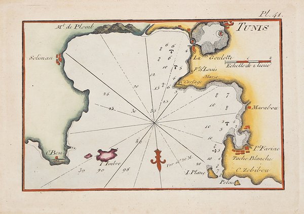 Piano nautico tratto dal " Recueil des principaux plans des ports & rades de la Méditerranée" di Josepgh Roux, pubblicato per la prima volta a Marsiglia nel 1764 e successivamente ristampato - ampliato - a Genova da Yves Gravier con il titolo "Recueil de 163 principaux plans des ports et rades de la Mediterranée" (1804).Ulteriore edizione dell'opera, con il titolo "Plans des ports ed des rades de la Mer Méditerranée." è stampata a Livorno da Carlo Tesi nel 1858. Incisione in rame, finemente acquarellata a mano, in ottimo stato di conservazione. First published in the "Recueil des principaux plans des ports et rades de la Mer Mediterranee", 1764, this nice nautical chart is taken from the rare "Plans des ports ed des rades de la Mer Méditerranée." published in Leghorn by Carlo Tesi, 1858. Copperplate with fine colouring, in very good condition. Cfr.