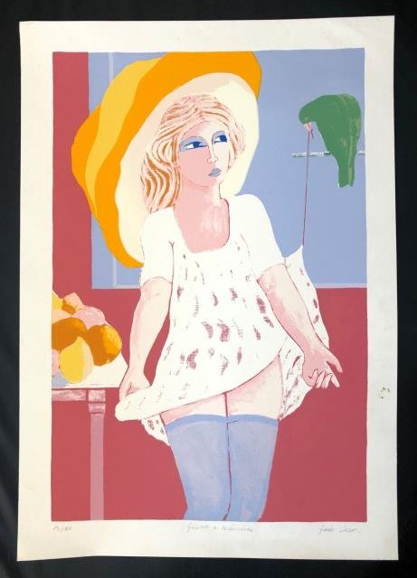 Litografia in colore, 1980 circa, cm 48 x 68 circa (il foglio) prova 13/100 in basso a sinistra, titolata "Guido e Seduzione" in basso al centro, firmata "Guido Vion" in basso a destra. Piacevole e grazioso soggetto in pastosa e vivace coloritura. Tre macchiette verdi al margine laterale destro peraltro buono stato.