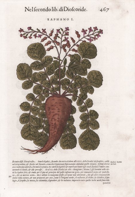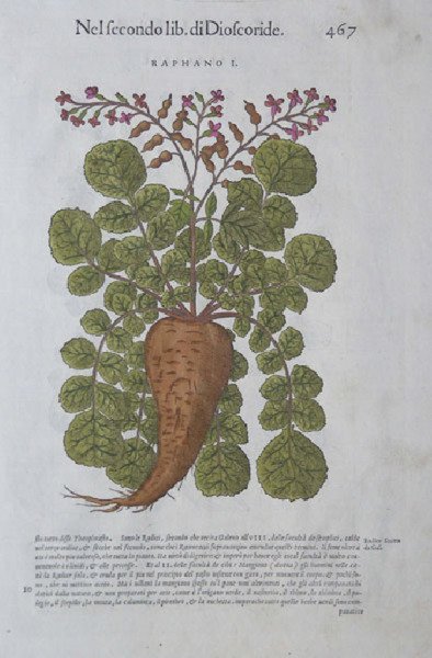 Opera tratta da I discorsi di M. Pietro Andrea Matthioli sanese, medico cesareo, et del serenissimo prencipe Ferdinando arcidvca d'Austria & c. Ne i sei Libri di Pedacio Dioscoride Anazarbeo della materia medicinale. ' Con dedica alla Principessa Giovanna, arciduchessa d’Austria (il Mattioli era medico reale), escono in volgare, nel 1568, i sei libri di nuovo dallo istesso autore ricorretti, & in più di mille luoghi aumentati. Con le figure grandi tutte di nuovo rifatte, & tirate dalle naturali & vive piante & animali, & in numero maggiore che le altre per avanti stampate. ' Lo stesso Pietro Andrea Mattioli presenta così la nuova edizione del libro, che già ha ricevuto molti consensi e che toccherà il culmine del successo grazie, appunto, alla forma di presentazione molto più organica, alla completezza delle informazioni, e, soprattutto, alla ricchezza e alla chiarezza delle illustrazioni. Chi sapesse tutte le virtù delle piante farebbe miracoli: questo enunciato dell’autore sembra animare per primo proprio lui, che va a cercare con certosina pazienza ogni minimo appiglio per lodare le virtù medicinali di ogni erba, raccontando ogni aneddoto, scoprendo ogni notizia curiosa, riportando ogni considerazione fatta sull’argomento da altri studiosi prima di lui. ' Il tono enciclopedico dell’opera si avverte, in maniera evidente, fin dalla dedica. Il discorrere dell’autore, le cui radici toscane o, per meglio dire, senesi non si smentiscono, è agile, piano, adatto ad un pubblico ampio, anche meno colto e poco preparato ma che, in qualche maniera, faceva parte del vasto mondo della medicina e della farmacia del tempo. Non è un caso che il testo sia tra quelli rimasti più a lungo in uso, anche nel piccolo bagaglio librario di famiglie povere o quasi analfabete. ' Alla sostanziosa dedica segue un proemio dedicato agli addetti ai lavori e le solite lettere di complimenti. Seguono due copiose tavole, cioè due indici: uno analitico per tutte le voci, l’altro per patologie. ' L’opera vera e propria inizia con il ritratto a piena pagina di Mattioli e illustra, in sequenza, le piante medicinali (concentrate nei primi quattro libri) e una serie di preparazioni (oli, unguenti, ecc.). Per Mattioli l’occasione è ghiotta sia per potersi dilungare sulla esatta identificazione delle specie, mostrando una vasta preparazione botanica, sia, soprattutto, per mostrare le splendide immagini delle piante, che, a volte, sono anche più di una per esemplare e messe a confronto, qualora il lettore avesse dubbi. Il secondo libro è dedicato in parte agli animali marini (ricci, spugne, seppie, pesci, ecc.) in parte a quelli terrestri (lepri, capriolo, castoreo, rospo, ecc.), comprese le vipere e le api con relativi prodotti (miele, cera, propoli, ecc.). Il quinto libro è dedicato ai minerali e il sesto ai veleni. ' Di ogni voce viene riportato il testo di Dioscoride tradotto in italiano, un esame moderno di identificazione con analogie e confronto dei pareri di autori diversi poi le virtù e i nomi in più lingue. ' Un’opera che ha lasciato il segno nella letteratura medica e farmaceutica del Rinascimento e che, ancora oggi, sprizza fascino ad ogni pagina. Plate taken from I discorsi di M. Pietro Andrea Matthioli sanese, medico cesareo, et del serenissimo prencipe Ferdinando arcidvca d'Austria & c. Ne i sei Libri di Pedacio Dioscoride Anazarbeo della materia medicinale printed in Venice by Vincenzo Valgrisi. Mattioli's Italian translation of the works of Dioscorides. ' Mattioli (1501-1577) was a Siennese doctor and naturalist. He described more than one hundred new plants and contributed to the development of medical botany. This, his most important work, was first printed in 1544 in Italian, 1554 in Latin, French in 1561, Czech in 1562, and in German in 1563. ' The wood cuts in his work were accurate and standardized enough to allow for easy identification. While nominally a commentary on the work of the botanist Dioscordies, Mattioli significantly expanded the work by adding major new contributions. He relied in part on the contributions of the Turkish diplomat, Buscecq, his doctor, Quakelbeen, and the famed botanist, Luca Ghini, who founded the botanical garden in Pisa. ' In this work, Mattioli significantly provided the first known observation of a tomato being grown and eaten in Italy. Woodcut with fine later hand colour, good condition. Cfr.