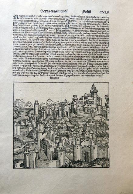Anton Koberger, Norimberga, 1493. Dal “Liber Chronicarum Nurembergensi”, xilografia in b/n, cm 32,5 x 47,5 (il foglio), al verso del foglio volti di pontefici, testo in latino. La monumentale opera dello Schedel, il "Liber Cronicarum", rappresenta uno “dei più straordinari lavori mai realizzati” dall’editoria del XV secolo. Foglio restaurato al margine superiore, altrimenti buon esemplare.