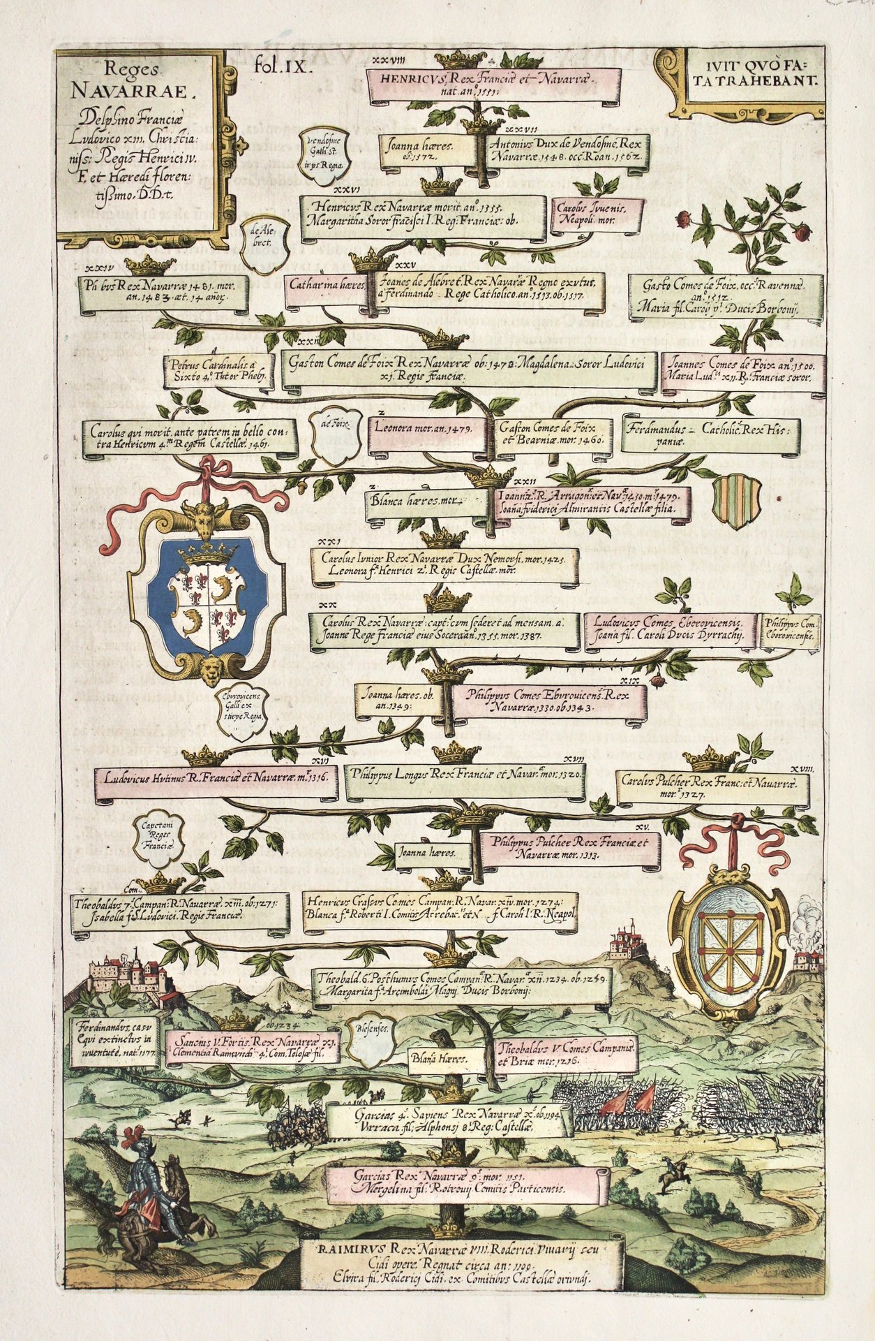 Incisione in rame mm 400x250 (foglio 460x300), dipinta a mano, tratta da “Principum Christianorum stemmata”, opera che illustra gli alberi genealogici delle casate regnanti in Europa, inseriti in un paesaggio che spesso raffigura la veduta realistica della capitale dello stato o riporta una carta geografica dello stesso, oltre a bandiere, stemmi e ricchi cartigli. L’opera, molto nota per la ricchezza ed eleganza delle tavole, è una delle più ricercate di genealogia araldica. Ottimo esemplare.