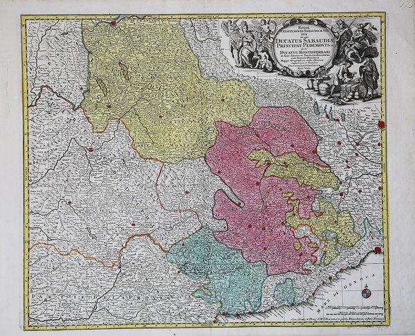 Versione firmata da Tobias Conrad Lotter della Mappa di Mattheus Seutter. La carta ripropone, modificandone il cartiglio, la carta dallo stesso titolo (di J.B. Homann, del quale Seutter era stato collaboratore). Titolo in alto a destra, in un cartiglio decorato raffigurante una scena mercantile. Le Valli valdesi sono indicate come: "Les Vallées des Vaudois", e numerosi sono i toponimi. Tobias Conrad Lotter (1717 - 1777) fu un incisore ed editore di mappe tedesco. Lotter sposò Euphrosina Seutter (1709-1784), figlia maggiore dell’editore Matthäus Seutter. Cominciò a lavorare nell'attività cartografica del suocero verso il 1740. Tra il 1740 e il 1744 produsse, sotto la direzione di Seutter, l'Atlas minor, Praecipua orbis terrarum imperia, regna et provincias, Germania potissimum tabelli. Alla morte di Seutter (1757), gli successe suo figlio, Albrecht Karl Seutter (1722-1762). Le lastre delle mappe di Suetter furono successivamente divise tra Lotter e l'editore Johan Mitchell Probst (1727 - 1776). Con il sostegno dei suoi figli, Tobias Conrad Lotter riuscì a costruire il successo economico e la reputazione professionale del suocero. Col tempo, Lotter divenne uno dei più importanti editori di mappe della metà del XVIII secolo che lavoravano nella scuola tedesca. ' Incisione in rame, bella coloritura editoriale, in ottimo stato di conservazione. Version signed by Tobias Conrad Lotter of the Map by Mattheus Seutter. The map reproduces, modifying the cartouche, the map of the same title (by J.B. Homann, of whom Seutter had been a collaborator). Title in the upper right corner, in a decorated cartouche depicting a mercantile scene. The Waldensian Valleys are indicated as: "Les Vallées des Vaudois", and there are numerous toponyms. Tobias Conrad Lotter (1717 - 1777) was a German engraver and map publisher. Lotter married Euphrosina Seutter (1709-1784), elder daughter of Matthäus Seutter. He began working at his is father-in-law's map business about 1740. Between 1740 and 1744 he produced, under Seutter's imprint, the Atlas minor, Praecipua orbis terrarum imperia, regna et provincias, Germania potissimum tabelli. Upon Seutter's death, in 1757, the firm's stock was taken over by his son, Albrecht Karl Seutter (1722-1762), who himself died in 1762, just a few years later. The remaining Suetter map plates were subsequently divided between Lotter and the publisher Johan Mitchell Probst (1727 - 1776). With the support of his sons, Matthäus Albrecht (1741-1810), Georg Friedrich (1744-1801) and Gustav Conrad (1746-1776), Tobias Conrad Lotter succeeded in building on the economic success and professional reputation of his father-in-law. In time, Lotter became one of the most prominent mid-18th century map publishers working in the German school. Copperplate with fine original colouring, good condition. Cfr. L. e G. Aliprandi, Le grandi Alpi ( 2005), p. 288 (v. 1); F. Barrera, Il Piemonte nella cartografia del Settecento, n. 30 ; Torino e il suo orizzonte, n. 107 e n. 123.