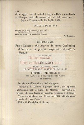 REGIO DECRETO CHE APPROVA LE NUOVE COSTITUZIONI DELLA CASSA DI PRESTITI RISPARMI E DEPOSITI A MARRADI