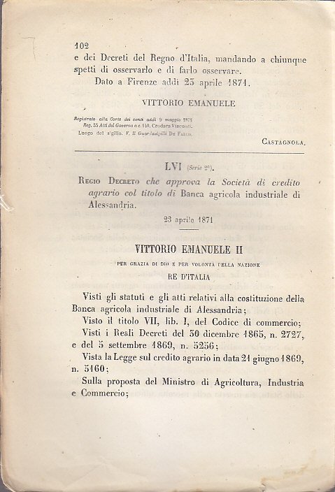 REGIO DECRETO CHE APPROVA LA SOCIETA' DI CREDITO AGRARIO COL TITOLO DI BANCA AGRICOLA INDUSTRIALE DI ALESSANDRIA Vittorio Emanuele II