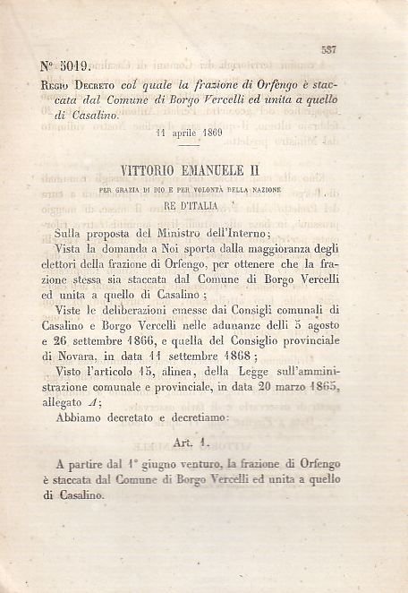 REGIO DECRETO COL QUALE LA FRAZIONE DI ORFENGO E' STACCATA DAL COMUNE DI BORGO VERCELLI ED UNITA A QUELLO DI CASALINO.