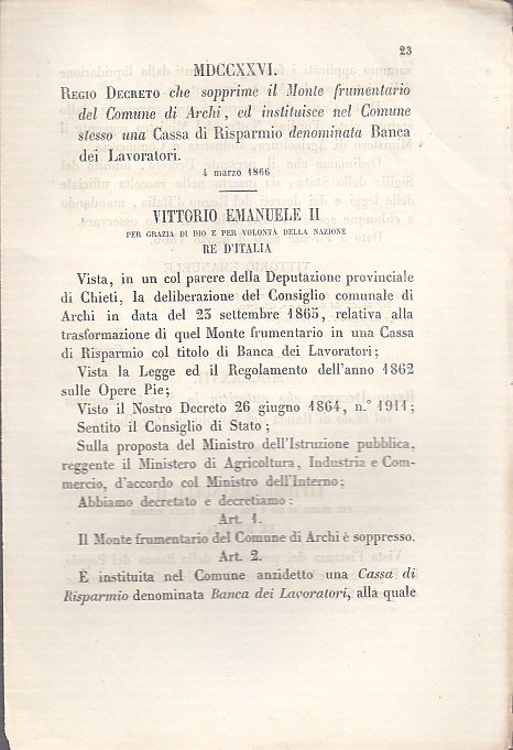 REGIO DECRETO MONTE FRUMENTARIO ARCHI BANCA DEI LAVORATORI 1866 Antico Originale