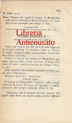Regio Decreto SEPARAZIONE SEZIONE ELETTORALE MONGARDINO DA ROCCA D ARAZZO 1877