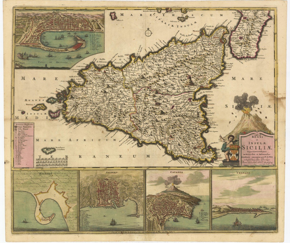 Carta geografica, antica ed originale, della Sicilia, in coloritura coeva, nell'utima rara edizione. La carta presenta entro riquadri in alto la pianta di Messina ed in basso le piante di Milazzo, Palermo, Catania e la veduta di Trapani. La carta è piegata anche trasversalmente e presenta una sbaffatura di colore al lato di destra.Rif:Valerio, Spagnolo, "Sicilia 1477-1861, La collezione Spagnolo-Patermo in quattro secoli di cartografia", n° 58
