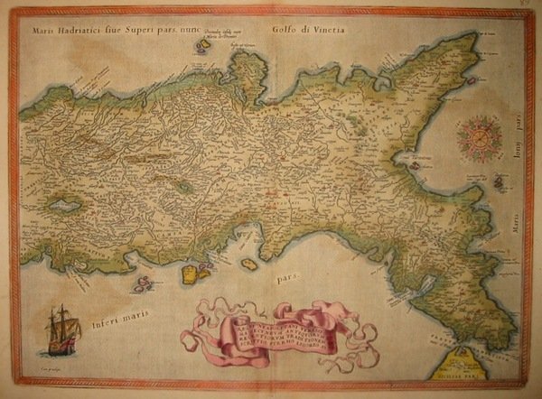 Incisione originale su rame (cm. 50x36,5 più ampi margini) tratta dal ‘Theatrum Orbis Terrarum’. Splendida coloritura coeva all’acquarello. Abili, minimi restauri lungo la piegatura centrale ma ottimo esemplare. Provenienza: Biblioteca del Castello di Cirey. Van den Broecke, 139.