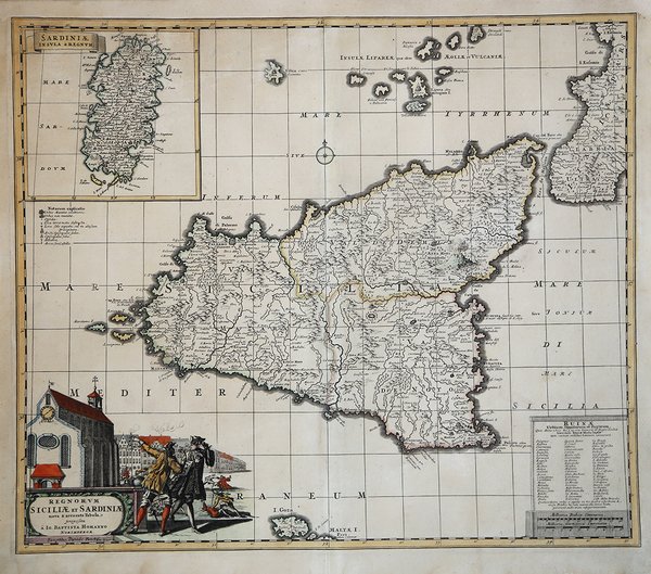Carta geografica della Sicilia di Johann Baptist Homann, stampata a Norimberga. La carta, che reca nell'angolo superiore sinistro un cartiglio contenente una piccola carta della Sardegna dal titolo "Sardinia Insula & Regnum", è tratta dal Neur Atlas […] von Johann Baptista Homann Nurnerg In verleguguns des Auctoris". La carta di Homann è stampata dallo stesso rame che David Funck aveva pubblicato nel 1693 in occasione del terremoto del gennaio dello stesso anno (cfr. Valerio-Spagnolo, p. 368). Johann Baptist Homann è stato un geografo e cartografo tedesco; nel 1702 fondò la sua casa editrice. Homann acquisì fama come uno dei principali cartografi tedeschi, e nel 1715 fu nominato geografo imperiale dall'imperatore Carlo VI. Nello stesso anno fu anche nominato membro dell'Accademia Prussiana delle Scienze a Berlino. Nel 1716 Homann pubblicò il suo capolavoro ' Grosser Atlas ueber die ganze Welt. Numerose mappe furono redatte in collaborazione con l'incisore Christoph Weigel. Homann morì a Norimberga nel 1724. Gli successe suo figlio Johann Christoph (1703-1730). L'azienda continuò dopo la sua morte come azienda degli eredi Homann, gestita da Johann Michael Franz e Johann Georg Ebersberger. Dopo successivi cambiamenti nella gestione, l'azienda si sciolse nel 1852. ' “Il titolo della carta recita: ' “. nova & accurata Tabula proposita a Io. Baptista Homanno Norimbergae. Sumptibus Davidis Funckij" con chiaro riferimento a David Funck quale editore della carta. In effetti questa carta utilizza lo stesso rame inciso da Homann nel 1693 per conto di David Funck, che aveva realizzato tale carta per raccontare e ricordare il terribile ter- remoto del gennaio dello stesso anno, riportandone anche i danni subiti dalle comunità locali. Le variazioni tra i due stati sono notevoli, ma non riguardano l'immagine topografica dell'isola, bensì i due angoli in basso a destra e a sinistra, e l'angolo in alto a sinistra. In basso a destra l'elenco delle città colpite dal terremoto è contornato da una cornice, che ingloba anche le sottostanti scale; in basso a sinistra, invece, scompare la firma dell'incisore Homann insieme alle isole di Pantelleria e di Linosa e, al loro posto, appare un cartiglio figurato con il nuovo titolo. Il significato del cartiglio non è di immediata interpretazione: sono rappresentati alcuni fatti di sangue in prossimità di una chiesa, che reca in facciata la data 1282, posta immediatamente sotto un orologio. La data rimanda senza ombra di dubbio ai Vespri Siciliani, la cui scintilla scoccò proprio davanti a una chiesa, santo Spirito di Palermo, che potrebbe ricordare vagamente quella dell'immagine, seppure in forme più marcatamente nordiche. Il ricordo di quei fatti trova una sua ragione nel particolare momento storico nel quale la mappa viene nuovamente pubblicata da Homann e cioè nella prima fase della guerra di successione spagnola (1701-1713). Con tale mappa, pubblicata a Norimberga, città che sotto l'influenza del nuovo stato Prussiano aveva aderito alla lega antifrancese, si voleva mettere in guardia Luigi XIV dal portare avanti le sue ambizioni sulla Sicilia attraverso la conquista del trono di Spagna, ricordando a lui e ai suoi alleati una vicenda storica particolarmente dolorosa per i francesi, che avrebbe anche potuto ripetersi. In un riquadro in alto a sinistra, al posto del titolo della precedente edizione ("Infelicis Regni Siciliae") compare una mappa della Sardegna col titolo "Sardiniae Insula & Regnum>> ' (155x160), al di sotto della quale rimane la vecchia "notarum explicatio", che presenta anche due simboli realtivi ai danni subiti dai centri abitati: un asterisco per "Loca terrae motu destructa" e una piccola croce greca per "Loca solo aequata, vel in abyssum praecipitata".” (Valerio-Spagnolo "Sicilia 1477-1861", p. 366). Acquaforte, finemente colorata a mano, in ottimo stato di conservazione. ' Bibliografia: Valerio-Spagnolo "Sicilia 1477-1861", pp. 366-368. Carta geografica della Sicilia di Johann Baptist Homann, stampata a Norimberga. La carta, che reca nell'angolo superiore sinistro un cartiglio contenente una piccola carta della Sardegna dal titolo "Sardinia Insula & Regnum", è tratta dal Neur Atlas […] von Johann Baptista Homann Nurnerg In verleguguns des Auctoris". La carta di Homann è stampata dallo stesso rame che David Funck aveva pubblicato nel 1693 in occasion del terremoto del gennaio dello stesso anno (cfr. Valerio-Spagnolo, p. 368). Johann Baptist Homann was a German geographer and cartographer; in 1702 he founded his own publishing house. Homann acquired renown as a leading German cartographer, and in 1715 was appointed Imperial Geographer by Emperor Charles VI. In the same year he was also named a member of the Prussian Academy of Sciences in Berlin. In 1716 Homann published his masterpiece ' Grosser Atlas ueber die ganze Welt; numerous maps were drawn up in cooperation with the engraver Christoph Weigel the Elder. Homann died in Nuremberg in 1724 and was succeeded by his son Johann Christoph (1703-1730). The company carried on upon his death as Homann heirs company, managed by Johann Michael Franz and Johann Georg Ebersberger. After subsequent changes in management the company folded in 1852. ' “Il titolo della carta recita: ' “. nova & accurata Tabula proposita a Io. Baptista Homanno Norimbergae. Sumptibus Davidis Funckij" con chiaro riferimento a David Funck quale editore della carta. In effetti questa carta utilizza lo stesso rame inciso da Homann nel 1693 per conto di David Funck, che aveva realizzato tale carta per raccontare e ricordare il terribile ter- remoto del gennaio dello stesso anno, riportandone anche i danni subiti dalle comunità locali. Le variazioni tra i due stati sono notevoli, ma non riguardano l'immagine topografica dell'isola, bensì i due angoli in basso a destra e a sinistra, e l'angolo in alto a sinistra. In basso a destra l'elenco delle città colpite dal terremoto è contornato da una co