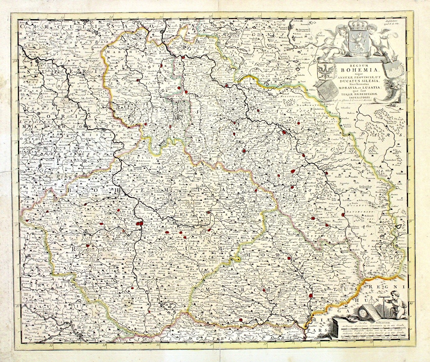 Incisione in rame, colorata d'epoca ai confini, 480x570. Ben conservata, margine destro con strappo anticamente restaurato entro la parte incisa, con rinforzo al retro, tracce di sporco superficiale; restauro alla parte inf. della piega centrale.