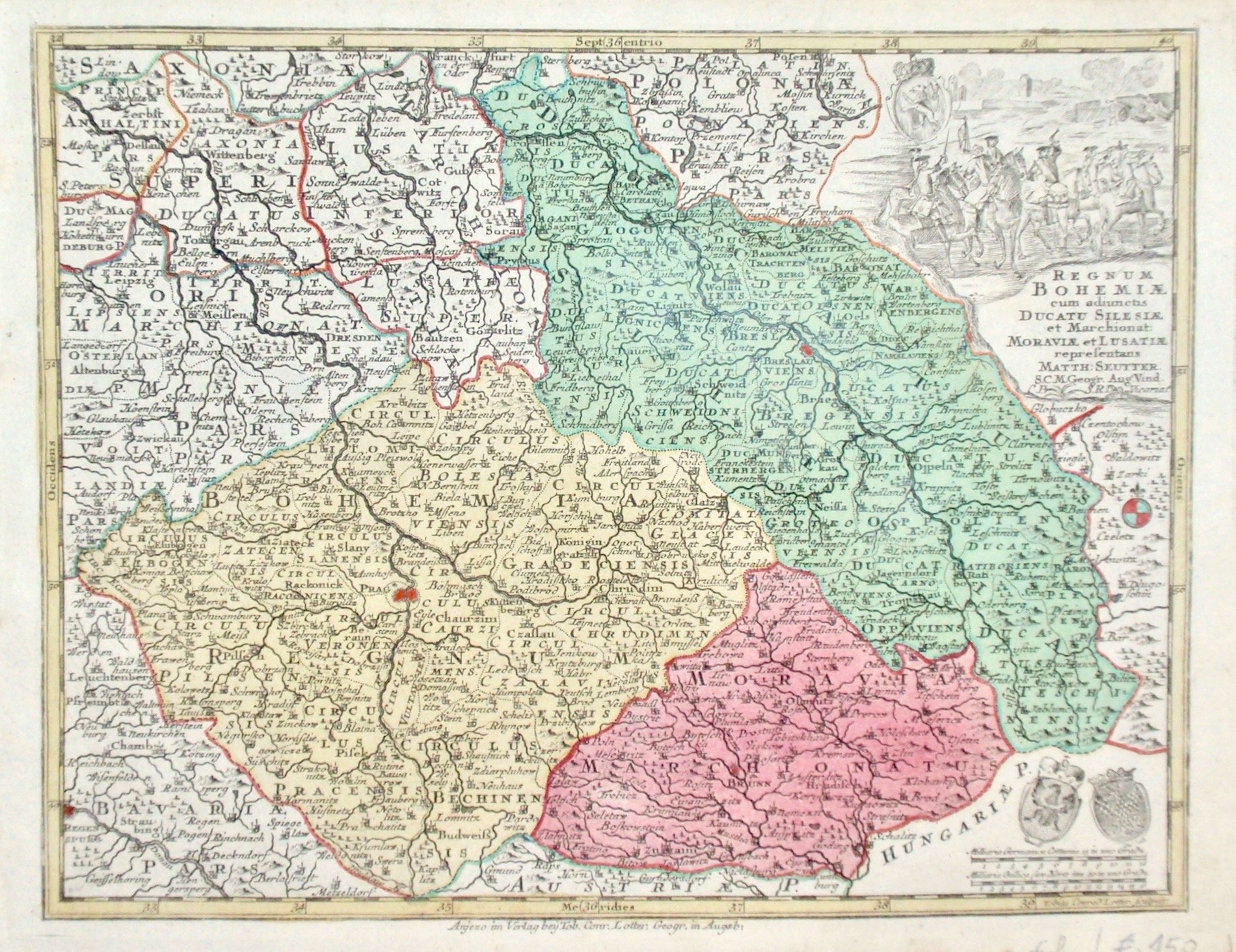 Incisione in rame, colorata d'epoca, mm 195x255, tratta da "Atlas minor". Lotter, incisore e geografo tedesco, dopo aver lavorato per Seutter, suo suocero, ne rilevò l'attività alla sua morte mantenendo alto il livello artistico della sua produzione. Ottimo esemplare fascinoso, con cartiglio decorativo nell'angolo destro superiore, raffigurante cavalieri.