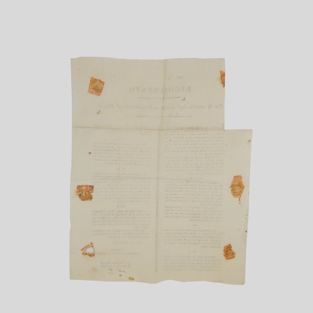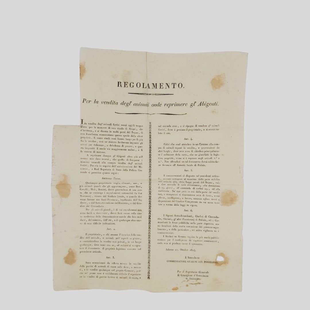 Foglio volante sottoscritto dall’Intendente di Salerno Vincenzo Guarini del Poggiardo, cm 43×34,5. Mancanza al margine bianco (cm 5×13), tracce d’uso, piccolo foro. Raro. Il reato di abigeato era molto diffuso nel XIX secolo.