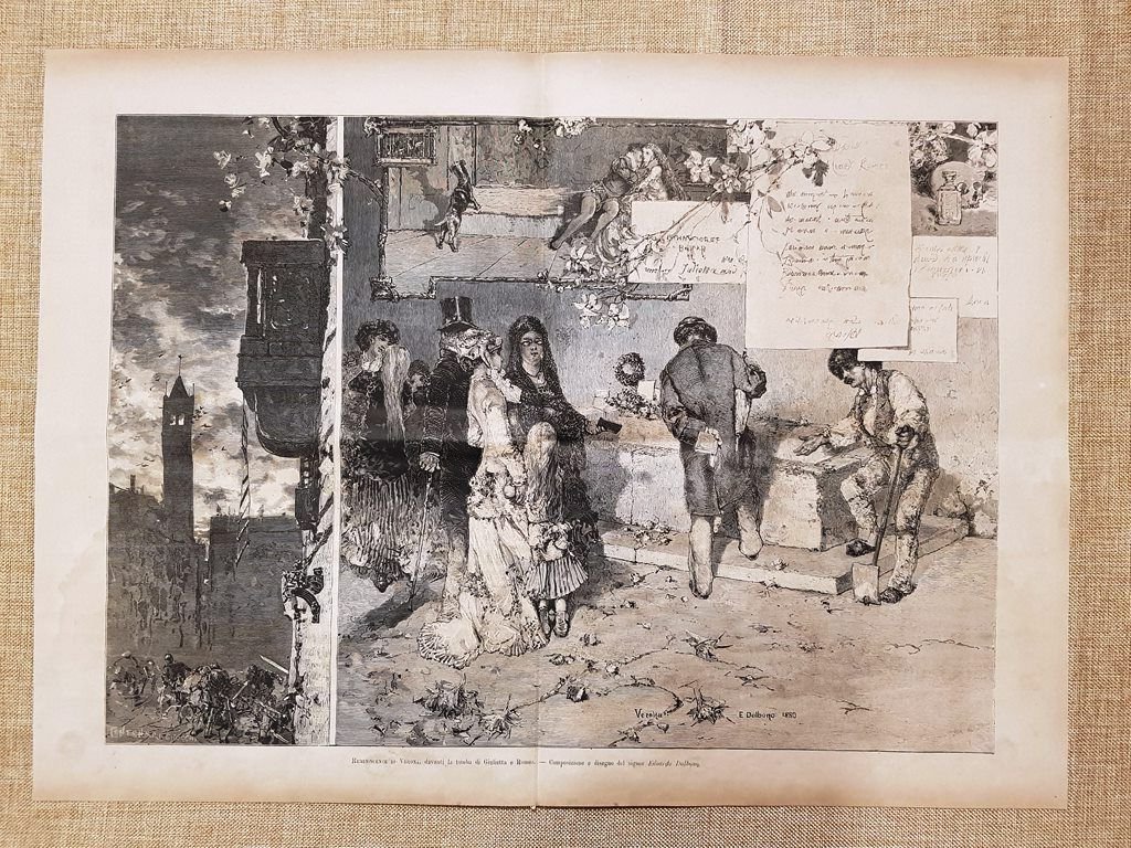 Reminiscenze di Verona davanti tomba di Giulietta e Romeo Edoardo Dalbono 1880 Rara stampa estratta da pubblicazione del 1880 Stampa enorme Reminiscenze di Verona, davanti la tomba di Giulietta e Romeo Composizione e disegno di Edoardo Dalbono Cm 36,00 x 49,00 1880-065