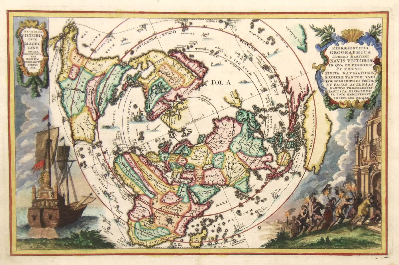 Incisione in rame, 213x357. Interessante carta del nord America che pone in risalto le zone cattoliche (chiare) da quelle non illuminate dalla Fede (scure) come dice l'autore nel titolo. Scherer, gesuita, pubblicò il suo "Atlas Marianus" dedicando particolare attenzione ai viaggi di scoperta marittimi. Arricchita da una bella scena religiosa e due cartigli. Ottimo esemplare.