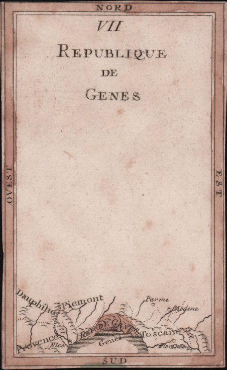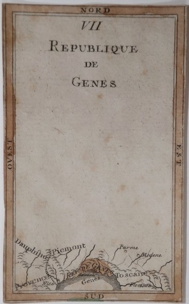 Rarissima carta da gioco pubblicata a Parma nel 1790 (ma incisa a Roma da Marco di Pietro). La carta fa parte del set di carte da gioco 'Geografia dell'Europa'. L’unico set completo conosciuto è al British Museum (oggi British Library) nella collezione di Lady Charlotte Schreiber (1812 – 1895). Traduttrice e donna d’affari, durante la sua vita mise insieme una vasta collezione di carte da gioco dei vari Paesi. La Geografia dell'Europa è un set di 77 carte, ciascuna delle quali è decorata con una mappa di una regione d'Europa. Il mazzo di carte è destinato al gioco tarocchi, ma invece che i cinque semi tradizionali - coppe, spade, denari, bastoni e arcani maggiori– abbiamo 5 tipologie di carte distinte da cinque colori corrispondenti ai diversi territori che vi sono rappresentati: il marrone indica l’Italia; il rosso la Germania; il verde la Francia; il giallo la Spagna e il blu il resto d’Europa. La carta "Spiegazione du Jeu", che prende il posto del Matto, porta il nome dell'incisore, "Gr. Par Marco di Pietro a Roma," mentre sulla carta del Mondo è riportato "Pour le Royal College des Nobles de Parme." Le iscrizioni sono in lingua francese. Il verso delle carte è decorato con lo stemma della città di Parma. Incisione su rame, coloritura originale, in ottime condizioni. xtremely rare playing card published in Parma in 1790 (but engraved in Rome by Marco di Pietro).The map is part of the 'Geography of Europe' set of playing cards. The only known set of this cards was inn the British Museum (now British Library) in the collection of Lady Charlotte Schreiber.The late Lady Charlotte Schreiber formed during her lifetime an extensive collection of the Playing-Cards of various countriesGeography of Europe; Parma, 1790. Imperfect pack of 77, each being a map of some part of Europe. It is arranged to be used for the tarocchi game, but the five divisions, cups, swords, coins, clubs, and atutti, are indicated only by borders of five different colours, brown, red, green, yellow, and blue. The first is devoted to Italy, the second to Germany, Switzerland, and the Low Countries, the third to France, the fourth to Spain and Portugal, and the fifth to the rest of Europe. The " Explication du Jeu," which takes the place of Matto, bears the engraver's name, " Gr. par Marco di Pietro a Rome," and No. XXI of the atutti, which is a " Mappe-monde," is inscribed " Pour le Royal College des Nobles de Parme." Inscriptions all in French. Backs decorated with the arms of Parma.Copperplate with original colour, very good condition. Cfr. Tooley, Dictionary, p. 431; F O'Donoghue, Playing cards bequeathed by Lady C. Schreiber (1901), p.10, n. 30.