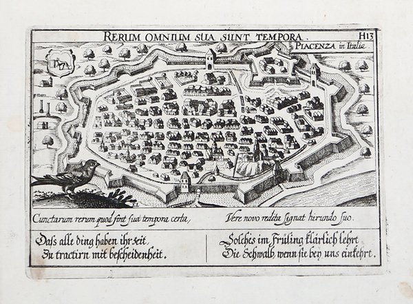 Veduta tratta dall'edizione del 1678 della celebre ' Sciagraphia Cosmica ' nota anche con il titolo ' Das ist Newes Emblematisches Buechlei, dainen in acht Centurijs die vornembste Stat, Vestung, Schlosser der ganzen Welt. ' stampata a Norinberga. La ' Sciagraphia Cosmica, venne ampliata sotto la supervisione di Kieser dopo la morte di Meisner nel 1625, arrivando quindi ad una composizione di 800 magnifiche incisioni. ' Ogni opera è caratterizzata da un motto sopra l'immagine, e da versi emblematici (in latino o tedesco). L'opera è la combinazione di due generi allora popolari, il libro degli stemmi e il "Teatro delle città". Tra i maestri incisori e miniatori che contribuirono a questa serie ci sono Matthäus Merian, Sebastian Furck, Christian Stimmer e forse anche Meisner stesso, che concepì l'opera e contribuì a buona parte della prosa. ' Incisione in rame, con margini, in perfetto stato di conservazione. View taken from the 1678 edition of the famous ' Sciagraphia Cosmica ' also known with the full title ' Sciagraphia Cosmica: ' Das ist Newes Emblematisches Buechlei, dainen in acht Centurijs die vornembste Stat, Vestung, Schlosser der ganzen Welt. printed in Nuremberg. The ' Sciagraphia Cosmica, was expanded under the supervision of Kieser after the death of Meisner in 1625, thus arriving at a composition of 800 magnificent engravings. ' Each engraving is characterized by a motto above the image, and by emblematic verses (in Latin or German). The work is a combination of two then-popular genres, the book of coats of arms and the "Town Book". Among the master engravers and illuminators who contributed to this series are Matthäus Merian, Sebastian Furck, Christian Stimmer, and perhaps Meisner himself, who conceived the work and contributed much of the prose. ' Copperplate engraving, with margins, in perfect condition. Cfr. Cremonini pagg. 57/58, 45a; M. Derata - L. Fanelli - A. Marchesi, "Piacenza incisa", 17