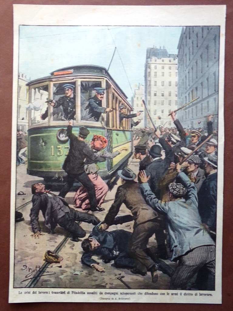 Le crisi del lavoro: tranvieri di Philadelphia assaliti da compagni scioperanti che difendono con le armi il diritto al lavoro (Achille Beltrame)