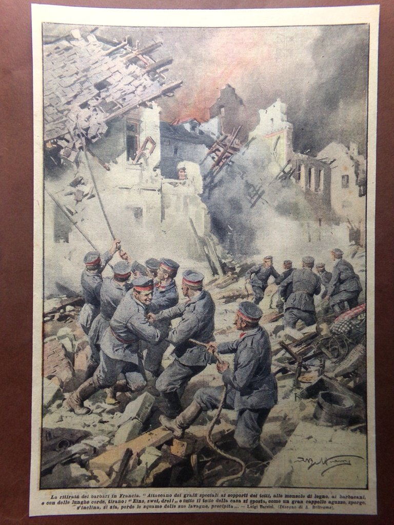 La ritirata dei barbari in Francia. "Attaccano dei graffi speciali ai sopporti dei tetti, alle mensole di legno, ai barbacani, e con lunghe corde tirano: "Eins, zwei, drei!" E tutto il tetto della casa si posta com un gran cappello aguzzo, sporge, s'inclina, si sfa, perde le squame delle sue lavagne, precipita" (Luigi Barzini) (Achille Beltrame)