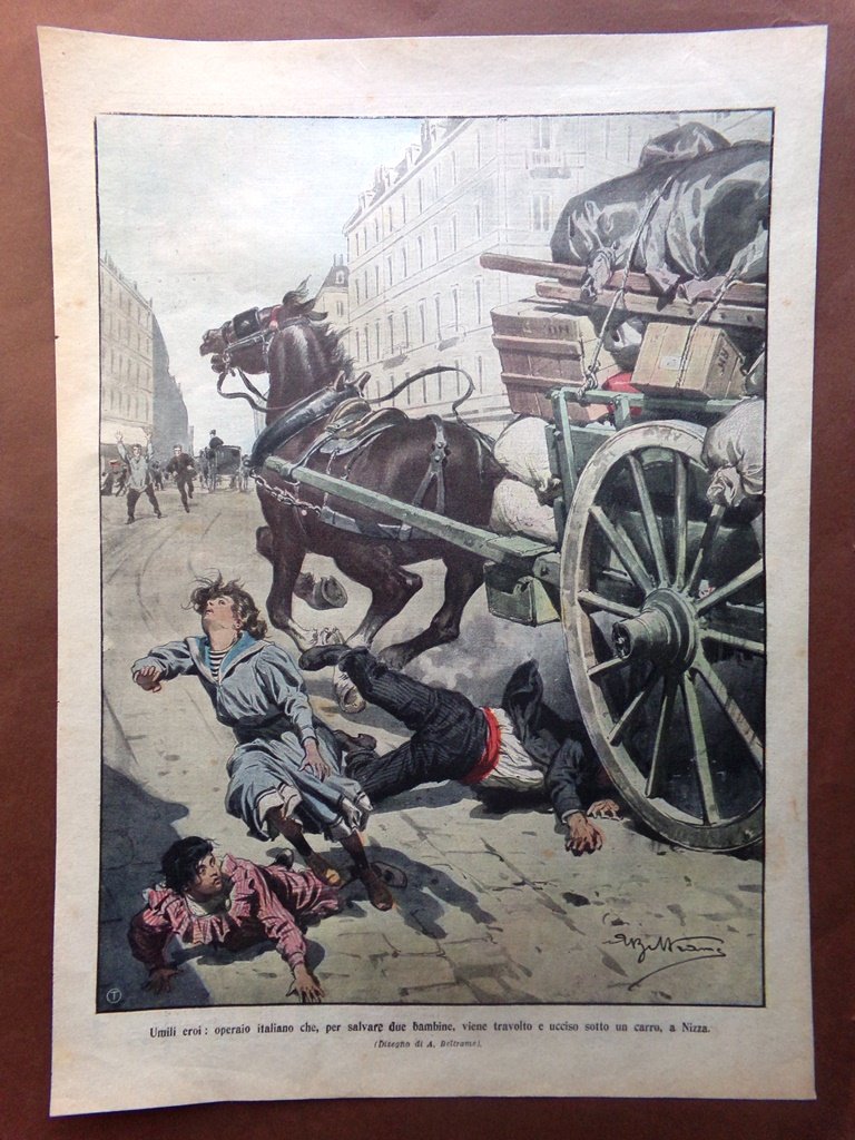 Umili eroi: operaio italiano che, per salvare due bambine, viene travolto e ucciso sotto un carro, a Nizza (Achille Beltrame)
