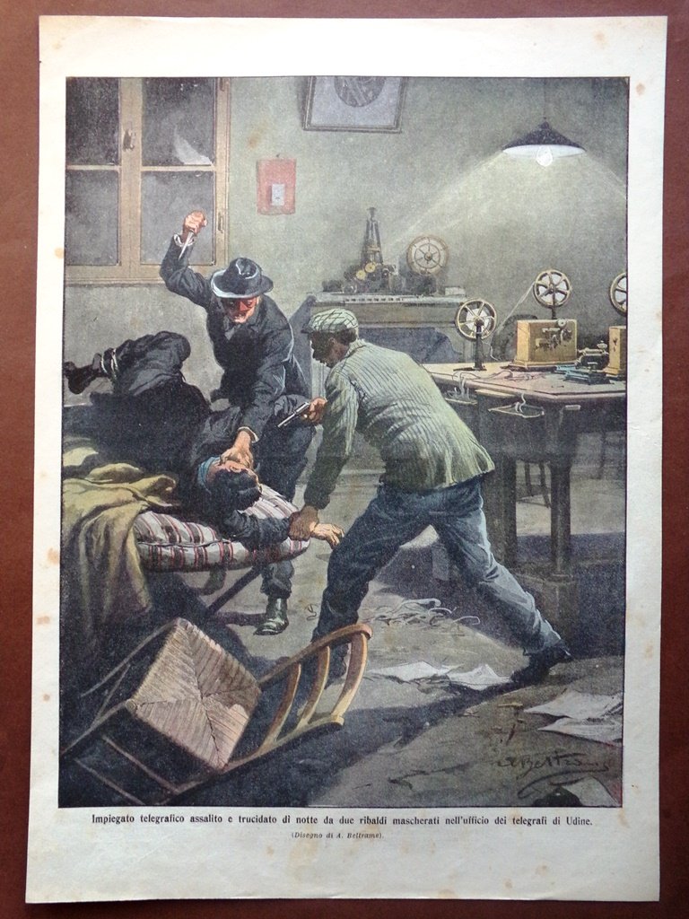 Impiegato telegrafico assalito e trucidato di notte da due ribaldi mascherati nell'ufficio dei telegrafi di Udine (Achille Beltrame)