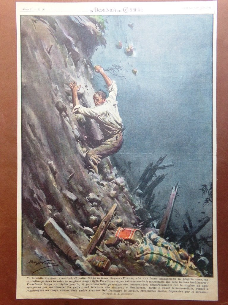 Un terribile dramma. Accortosi, di notte, lungo la linea Faenza-Firenze, che una frana minacciava la propria casa, un contadino portava in salvo la moglie e cinque figli. Poi ritornava per salvare anche le masserizie, ma ecco la casa inabissarsi. Trascinato lungo un ripido pendio, il poveretto lottò parecchie ore, attaccandosi disperatamente con le unghie ad ogni speranza per mantenersi "a galla" sul terriccio che slittava; e finalmente, ferito e quasi irriconoscibile, riuscì a raggiungere un luogo sicuro, dove cadde svenuto. Nel frattempo la moglie, credendolo morto, impazziva per lo strazio. (disegno di Achille Beltrame)