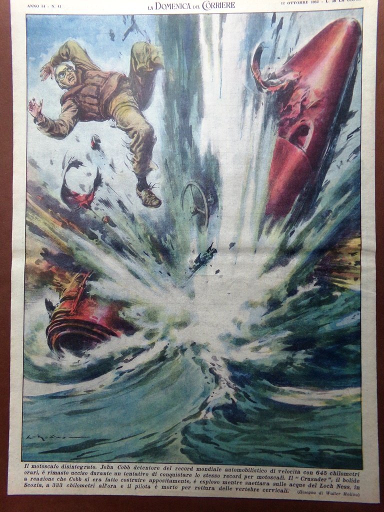 John Cobb detentore del record mondiale automobilistico di velocità con 645 km/h è rimasto ucciso durante un tentativo di conquistare lo stesso record per motoscafi. Il "Crusader", il suo bolide a reazzione è esploso sulle acque del Loch Ness in Scozia e il pilota è morto per rottura delle vertebre cervicali (disegno di Walter Molino)