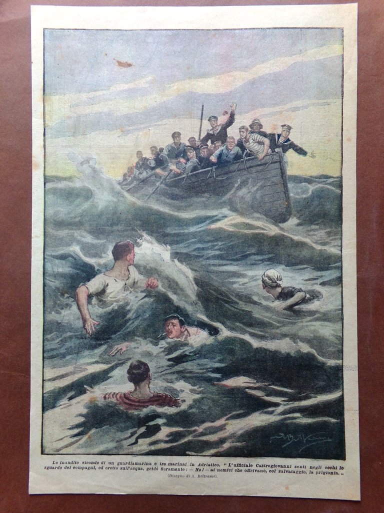 le inaudite vicende di un guardiamarina e tre marinai in Adriatico. "L'ufficiale Castrogiovanni sentì negli occhi lo sguardo dei compagni, ed eretto sull'acqua, gridò fieramente: No! ai nemici che offrivano, col salvataggio, la prigionia" (Achille Beltrame)