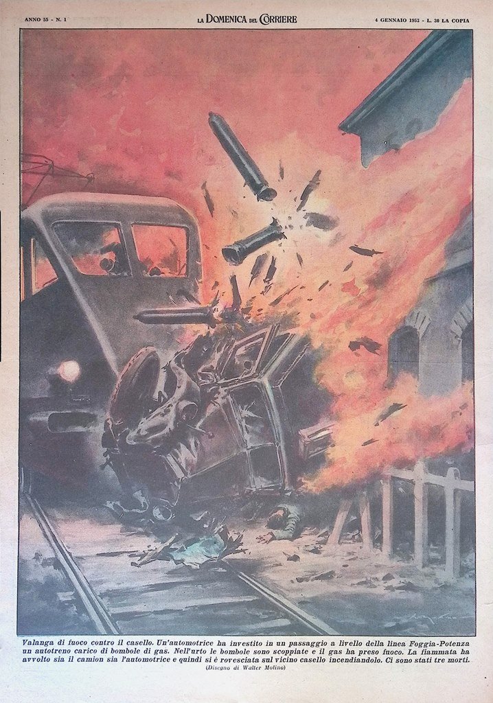 Valanga di fuoco contro il casello. Un'automotrice ha investito in un passaggio a livello della linea Foggia-Potenza un autotreno carico di bombole di gas. Nell'urto le bombole sono scoppiate e il gas ha preso fuoco. La fiammata ha avvolto sia il camion sia l'automotrice e quindi si è rovesciata sul vicino casello incendiandolo. Ci sono stati tre morti (Walter Molino)