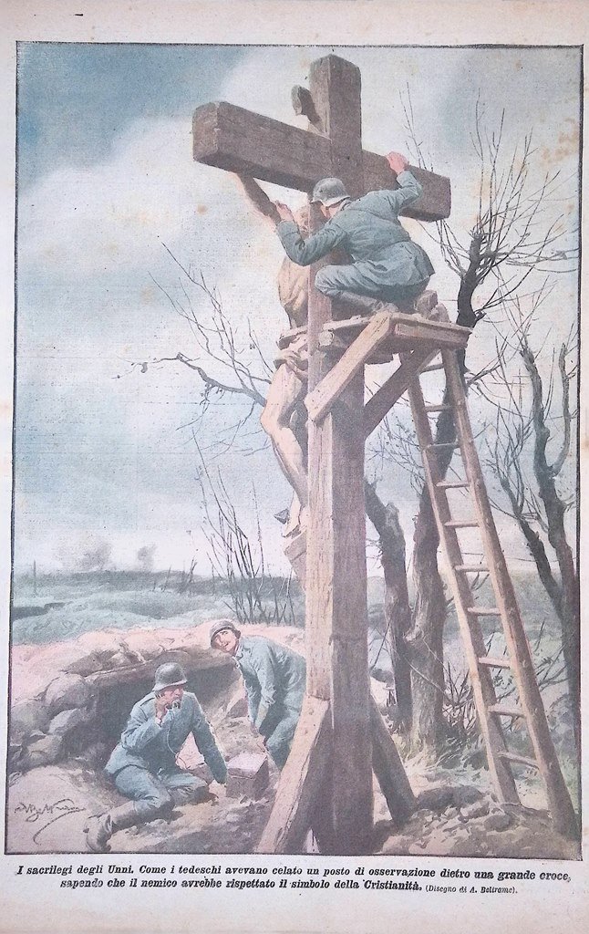 I sacrilegi degli Unni. Come i tedeschi avevano celato un posto di osservazione dietro una grande croce, sapendo che il nemico avrebbe rispettato il simbolo della Cristianità (Achille Beltrame)