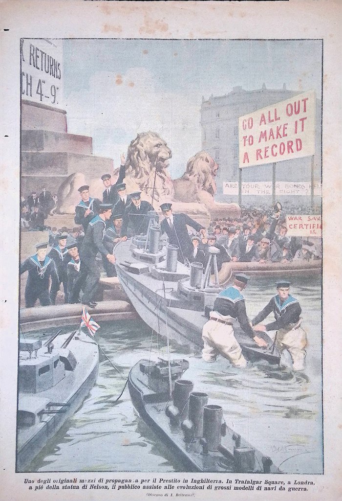 Uno degli originali mezzi di propaganda per il Prestito in Inghilterra. In Trafalgar Squadre, a Londra, a piè della statua di Nelson, il pubblico assiste alle evoluzioni di grossi modelli di navi da guerra (Achille Beltrame)