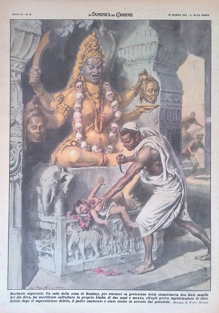 Barbarie superstiti. Un indù della zona di Bombay, per ottenere la protezione della sanguinaria dea Kali, moglie del dio Siva, ha sacrificato sull'altare la propria bimba di due anni e mezzo, poi è stato tratto in arresto dai poliziotti (Walter Molino)