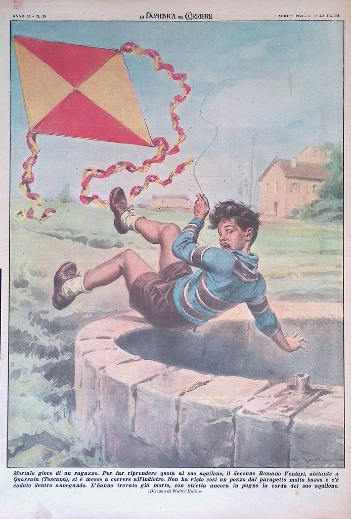 Mortale gioco di un ragazzo. Per far riprendere quota al suo aquilone, il decenne Romano Venturi, abitante a Quarrata (Toscana) si è messo a correre all'indietro. Non ha visto così un pozzo dal parapetto molto basso e c'è caduto dentro annegando (Walter Molino)