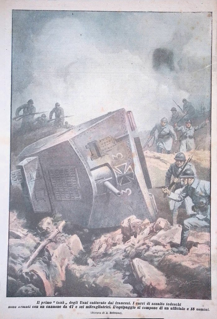 Il primo "tank" degli Unni catturato dai francesi. I carri di assalto tedeschi sono armati con un cannone da 47 e sei mitragliatrici. L'equipaggio di compone di un ufficiale e 18 uomini (Achille Beltrame)