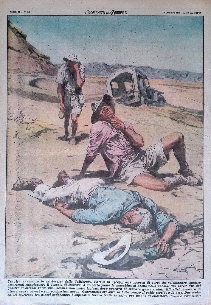 Tragica avventura in un deserto della California. Partiti in jeep alla ricerca di terre da colonizzare, quattro americani raggiunsero il deserto di Mohave. A un certo punto la macchina si arenò nella sabbia. Che fare? Uno dei quattro si diresse verso una località non molto lontana dove sperava di trovare gente e aiuti. Gli altri rimasero in attesa senza viveri e con pochissima acqua. Quarantotto ore durò la lotta contro il caldo torrido e la sete. Due esploratori morirono fra atroci sofferenze; i superstiti furono tratti in salvo per mezzo di elicotteri (Walter Molino)